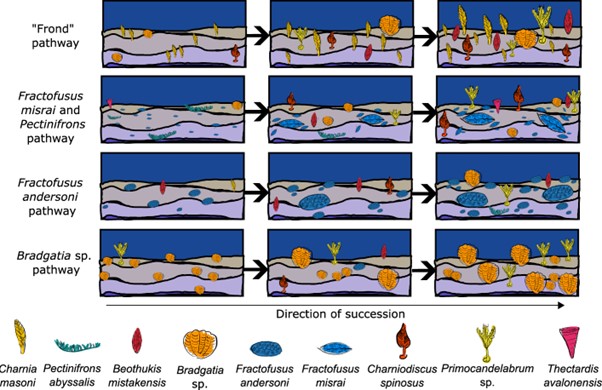 In this paper, we were interested in how these first animal communities developed. Ecological communities go through a process known as ecological succession, whereby the community changes through time from initial colonising species, to a stable climax community (e.g., from mosses and lichens, to shrubland, to forests). As communities mature, they tend to go through changes in their composition and community dynamics. For example, in forest systems, early colonisers such as mosses and fungi might facilitate later-stage trees by enriching the soil, but later stage trees might outcompete other plants for light by shading them. It has previously been suggested that, for Avalon communities, maturation is driven by a turnover community composition and an increase in tiering processes. Tiering processes, where different species occupy distinct vertical regions of the water column to avoid competition with each other, is normally a result of competition for resources between species. We wanted to test whether community maturity correlated with increases in tiering and community composition in order to understand the key evolutionary mechanisms in these first animal communities.