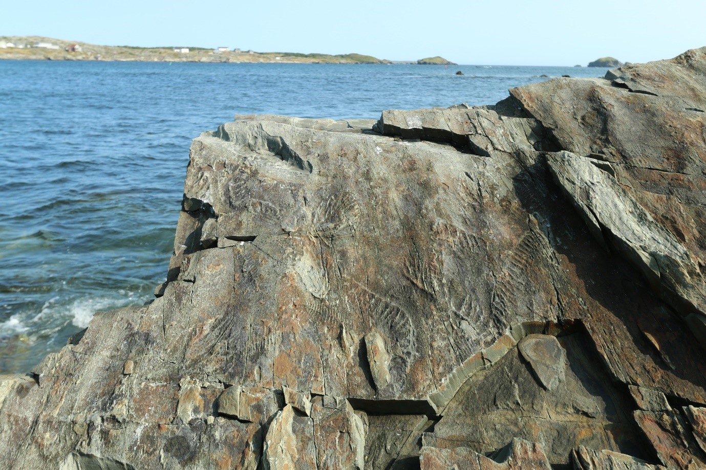 Caption: Fractofusus, Bradgatia, and Pectinifrons on the Melrose surface at Capelin Gulch, Discovery Geopark, Newfoundland, Canada. Walking over this surface is like walking over the ancient seafloor set in stone.