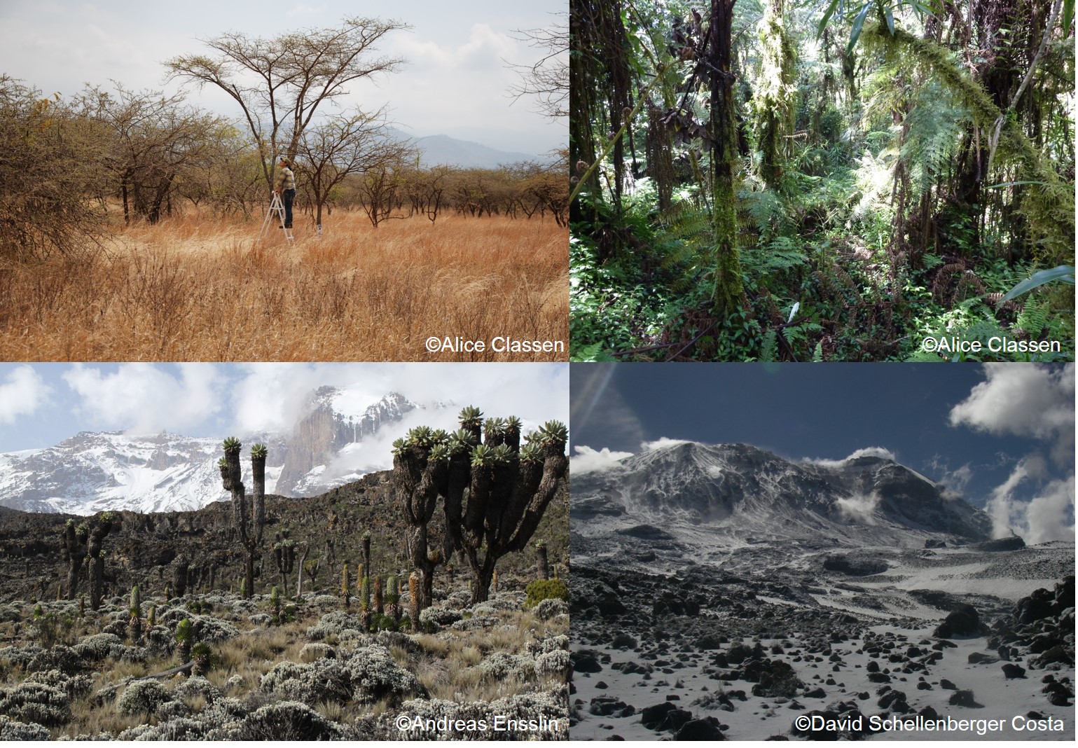 Mount Kilimanjaro has been formed by volcanic eruptions through the past three millions year which gave rise to the Shira, Mawenzi and the highest peak, the Kibo. Like other tropical mountains, Mount Kilimanjaro hosts a spectacular sequence of natural ecosystems – from the hot savannah in the lowlands over a belt of dense submontane and cloud forests to the afroalpine shrub vegetation with their fairytale-looking plants. Due to the strong climate gradient found on tropical mountains there is a very high turnover of species making them to the centers of biodiversity on the planet – in fact, there is no place in the world where you find a higher density of species than in tropical mountain regions. The plants, animals and microbes of tropical mountains maintain a large variety of ecosystem functions like water retention, nutrient cycling, carbon storage and pollination from which also human societies – also far away from mountains - strongly profit.