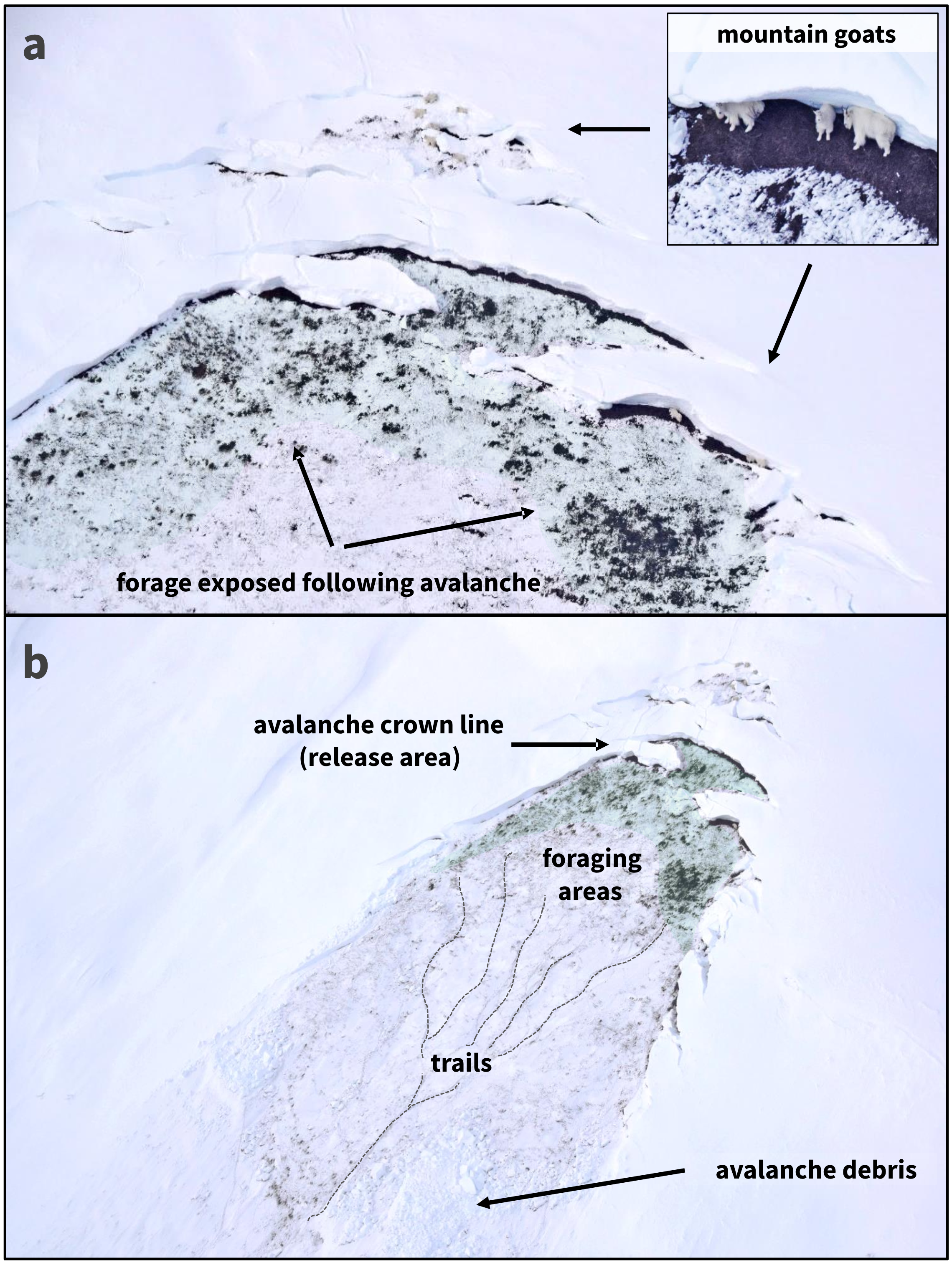 Famously described as "a climbing bearded beast the color of winter", mountain goats are an iconic species of North American mountain cultures and landscapes. A species of alpine ungulate belonging to a taxonomic group comprising 32 mountain dwelling species in 70 countries, mountain goats are specially adapted to life in steep, rugged terrain. Their use of cliffs as refugia is an effective counter to the risk of predation by wolves and other large carnivores but poses other dangers. During winter, snow avalanches are widespread in steep, mountain terrain and may exert significant risk to alpine species. A factor that may be especially pernicious because avalanche risk can be largely imperceptible with the unstable layers that trigger slides being buried deep within the snowpack.