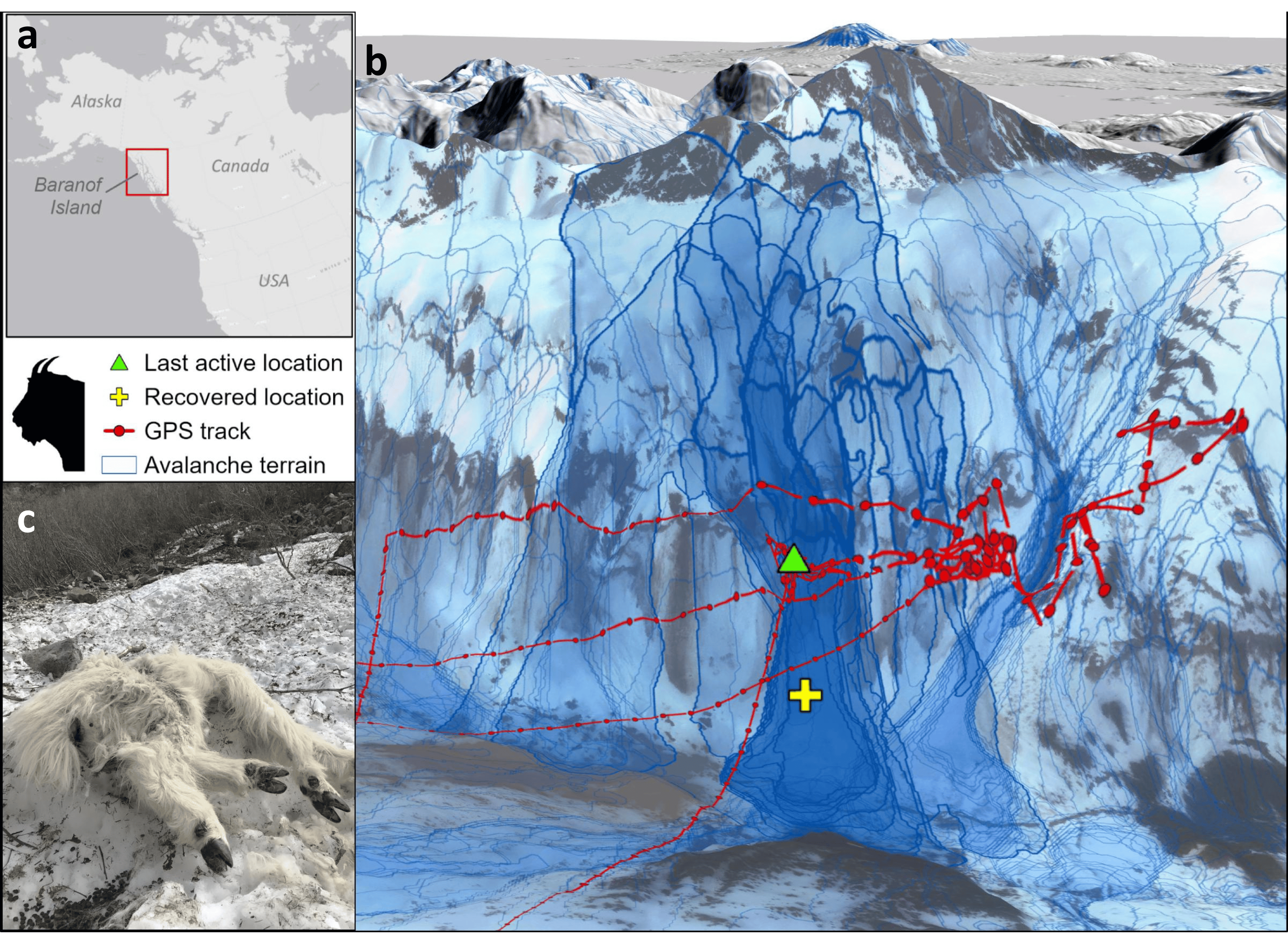 Estimation of mountain goat use of avalanche terrain. (a) Mountain goat study location where (b) GPS radio-collar location data were intersected with large-scale avalanche hazard indication maps to quantify individual mountain goat exposure to avalanches. The example 3D image illustrates typical winter use of avalanche terrain by an adult female mountain goat (BG041) that was caught (triangle) and subsequently buried (cross) by an avalanche in the Baranof Island study area in January 2016. Simulated avalanches that swept through the mountain goat mortality site are delineated (thick blue outlines), as well as all other avalanches in the area (light blue outlines). (c) A mountain goat (KG034) carcass partially buried in avalanche debris, near Klukwan, Alaska in May 2017. The animal suffered a depressed skull fracture among other critical injuries.