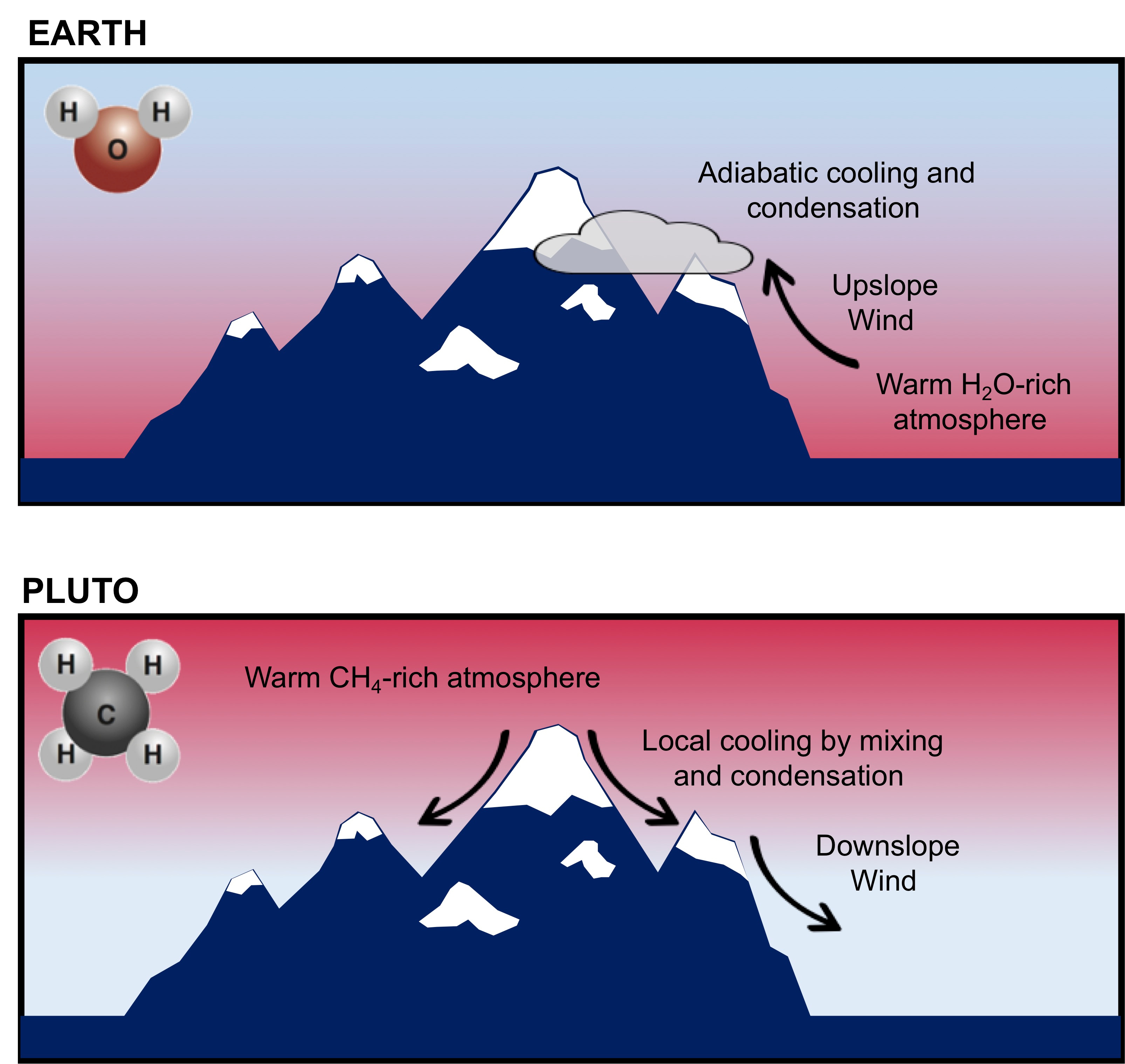 On our planet, atmospheric temperatures decrease with altitude, mostly because of the cooling induced by the expansion of the air in upward motions. As a consequence, surface temperatures also decrease with altitude because the cold, dense atmosphere cools the surface. Under such conditions, as moist wind approaches a mountain, it rises upslope and cools, with water condensing to form snow on the top of mountains. But on Pluto, the opposite occurs. The dwarf planet's atmosphere actually gets warmer as altitude increases, the surface temperature remains the same, and winds that travel down mountain slopes dominate.