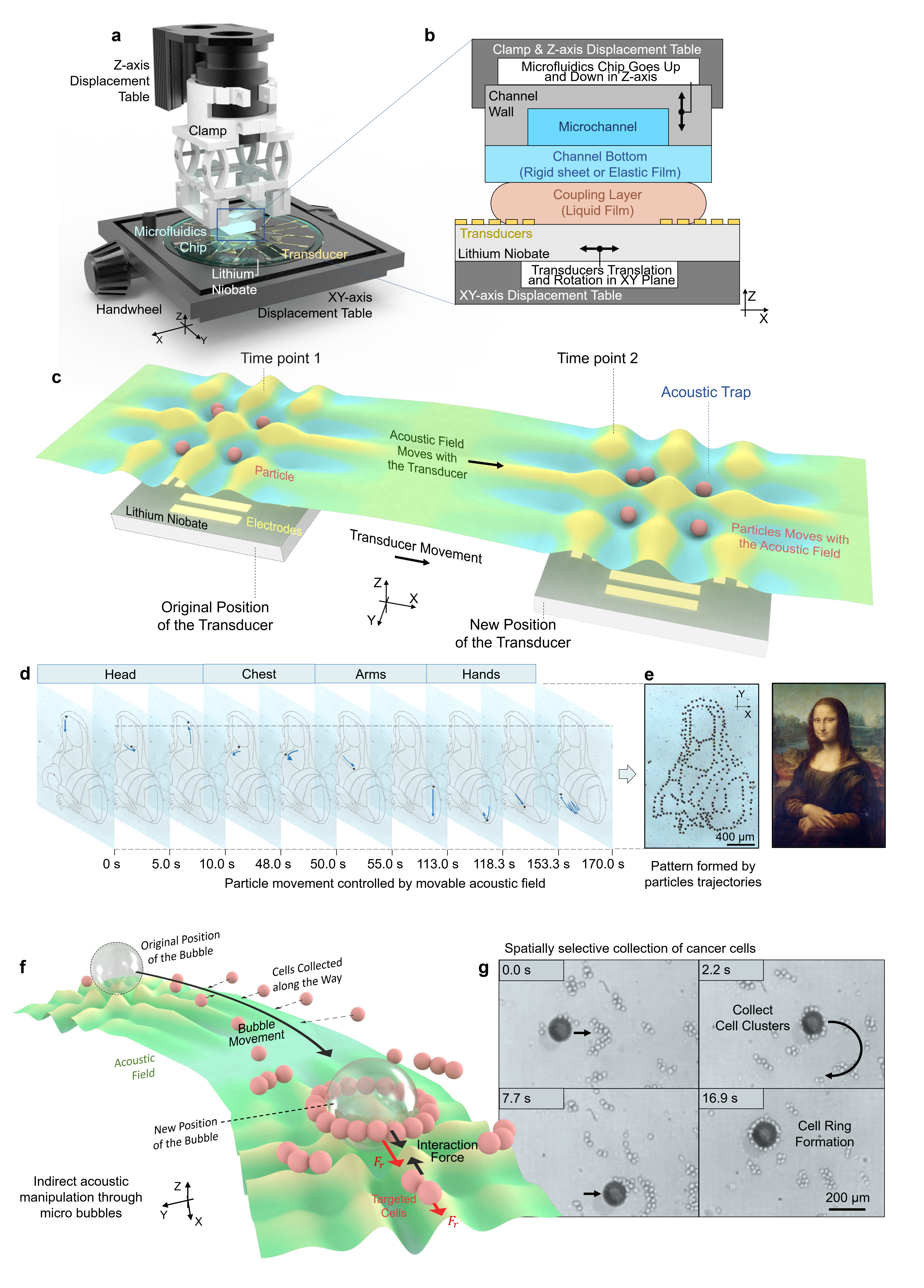 Figure 1. Experimental setup and working principle of the movable SAW tweezer system. a. Movable SAW tweezer platform setup. b. Multilayer structure of the device. c. Schematic diagram of the acoustic field movement method. d. Control of the movement trajectory of a 31.1 μm particle by the movable acoustic field. The particle positions are captured frame by frame. e. Mona Lisa painting and a Mona Lisa pattern depicted by the particle trajectories. f. Schematic diagram of the cell collection method. g. Utilizing bubbles to collect cancer cells and form circular cell clusters around bubbles.
