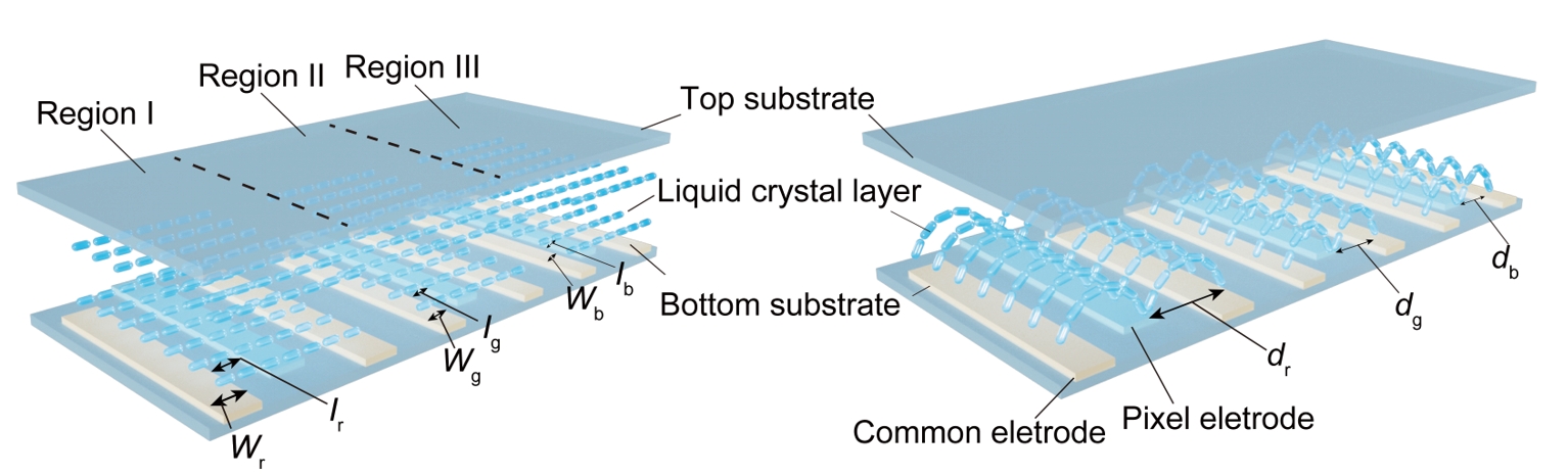 The core component of the proposed system is a customized color liquid crystal grating. In order to make the three colors of light passing through the color liquid crystal grating have the same diffraction angle, we design and fabricate a color liquid crystal grating with three different-pitch regions in one liquid crystal cell for different incident wavelengths, namely region I, region II and region III, as shown in Fig. 2. The three regions of the color liquid crystal grating are controlled by the same voltage. The color liquid crystal grating consists of a top substrate, liquid crystal layer, pixel electrodes, common electrodes and a bottom substrate. The pixel and common electrodes are etched by planar indium tin oxide electrode. The widths of common electrode of the three regions are wr, wg and wb, respectively. In each region, the width of the pixel electrode is the same as that of the common electrode. The electrode arrangement is optimized by using a separate periodic electrode arrangement to eliminate the fringe electric field and diffraction crosstalk among the three regions.