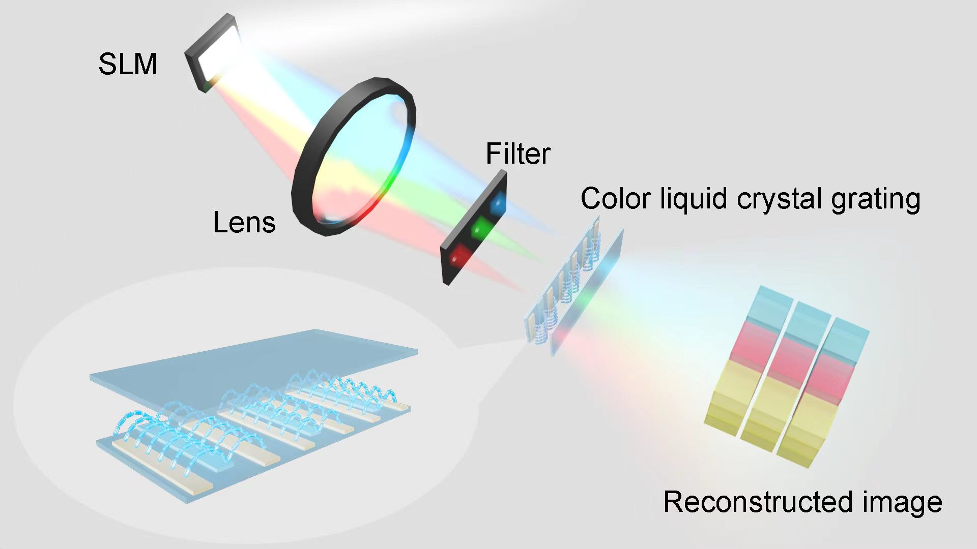 In this work, we propose a color liquid crystal grating based holographic 3D display system with large viewing angle. Figure 1 is the concept of the proposed system. Different from the traditional liquid crystal grating that has inevitable chromatic aberration, the proposed color liquid crystal grating can perform secondary diffraction modulation on red, green and blue reconstructed images with the same diffraction angle when the voltage is applied, thus avoiding chromatic aberration. In addition, a chromatic aberration-free hologram generation mechanism is proposed to cooperate with color liquid crystal grating to achieve large viewing angle color display. The proposed system shows a color viewing angle of ~50.12º, without any chromatic aberration.