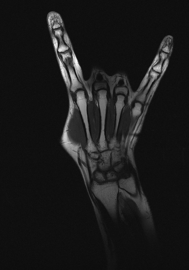 The glove coil has already allowed us to image the mechanics of a wide range hand motions, such as signing with American Sign Language gestures (Fig. 4), gestures from pop culture (Fig. 5), grasping objects, or even playing a keyboard. Graham was an accomplished musician, and I like to imagine his gloved hands improvising to the rhythm of the MR scanner, a kinetic symphony of tendons, nerves, bones, and muscles dancing as we look on in appreciation.