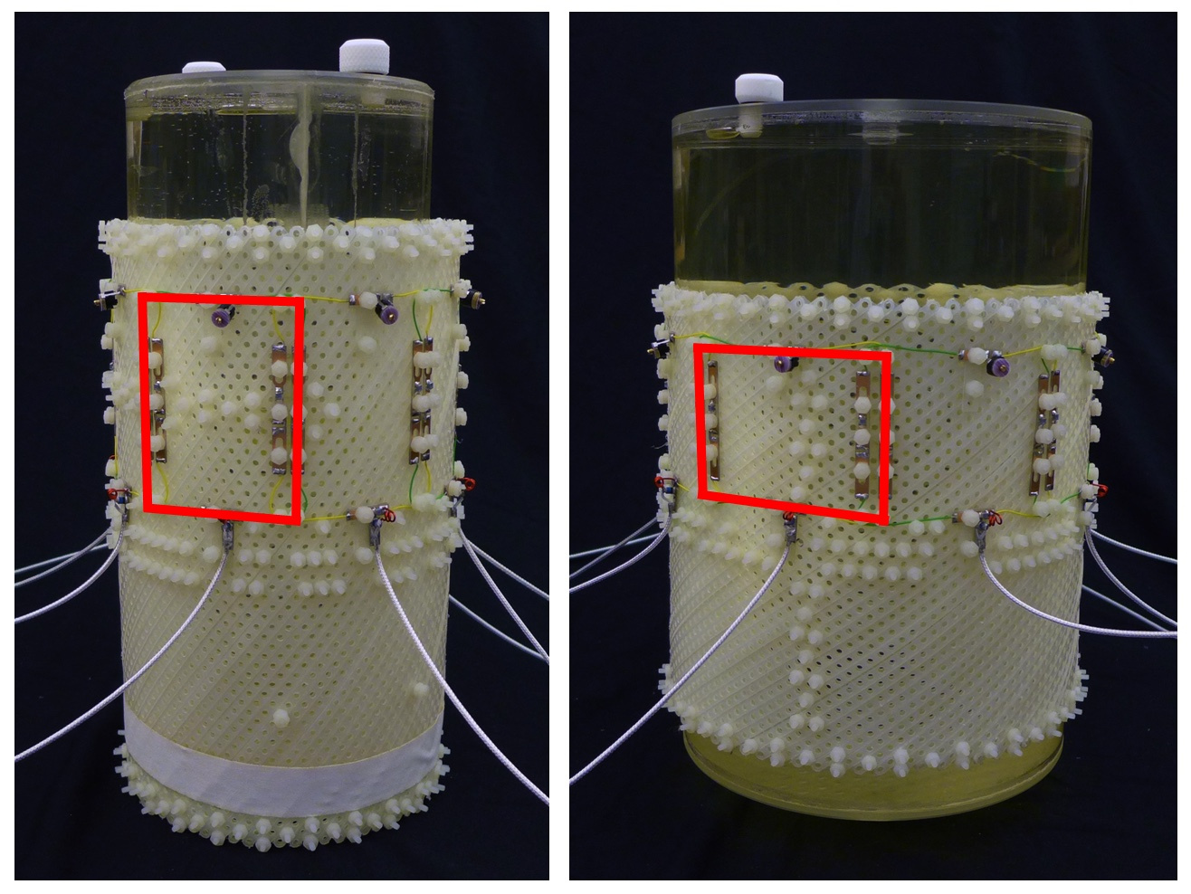| Figure 3: A trellis coil array on small and large phantoms, showing size adaptation. Surface coil elements supported on the trellis structure morph in shape from 6.5 × 9.5 cm to 9.5 × 6.5 cm, while preserving desirable decoupling properties. |