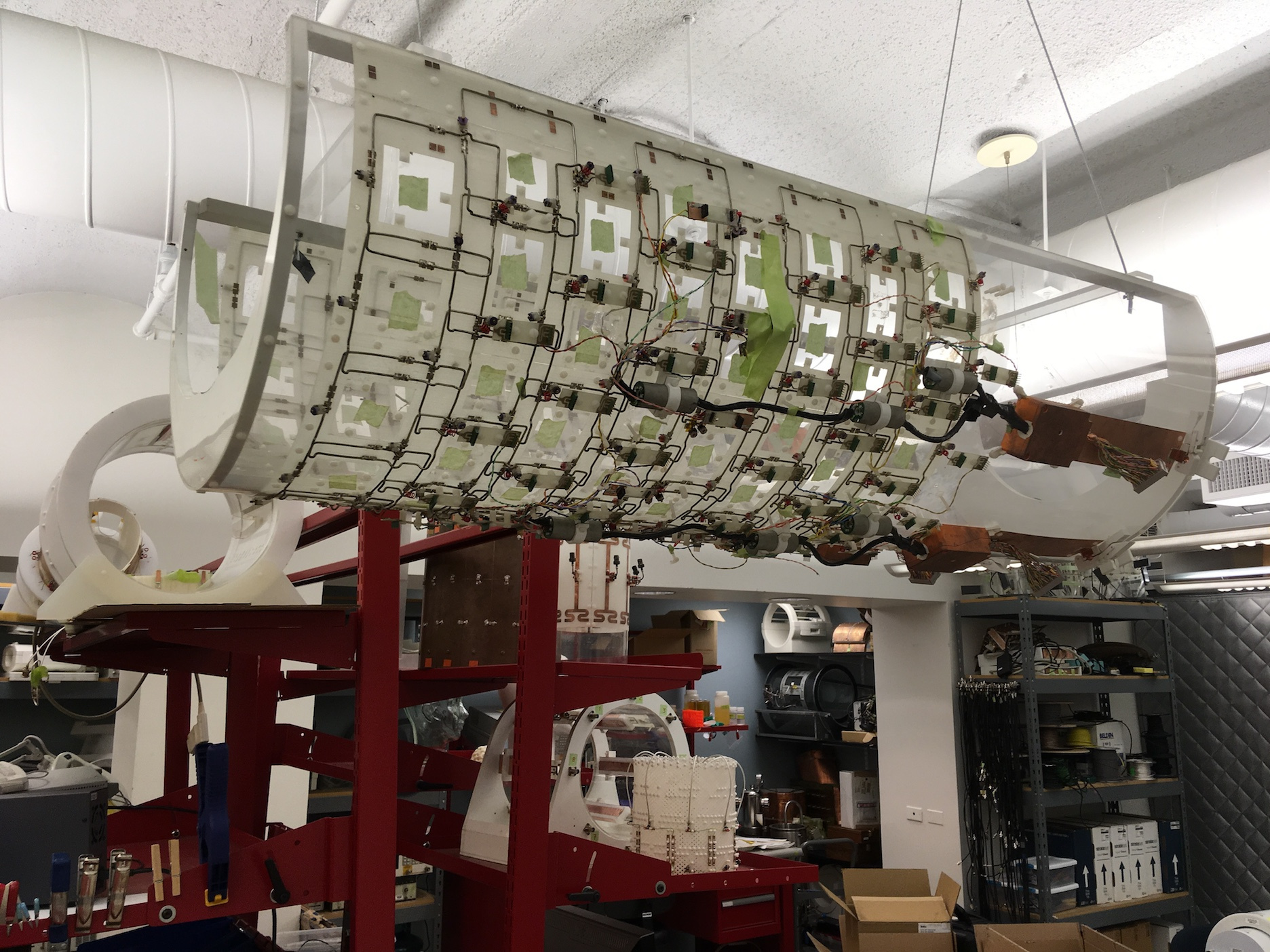 | Figure 2: The 124-element “bore-liner” coil array prototype, hanging from the ceiling in our radiofrequency engineering lab in New York. |