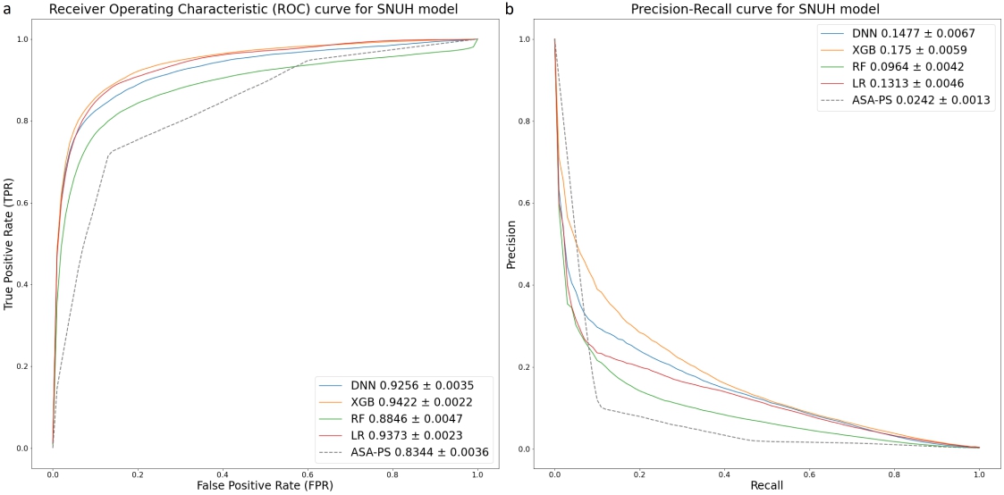 AUROC (a) and AUPRC (b) of several models for postoperative 30-day mortality in the SNUH dataset. The values of AUROC and AUPRC are presented as 95% confidence intervals. AUROC area under receiver operating characteristic curve, AUPRC area under precision-recall curve, DNN deep neural network, XGB extreme gradient boosting, RF random forest, LR logistic regression, ASA-PS American society of anesthesiologists physical status classification.