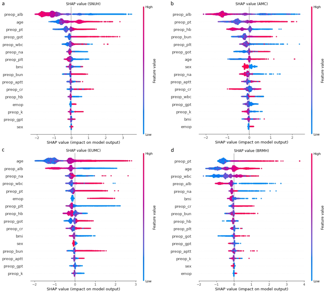 a SNUH model, b AMC model, c EUMC model, d BRMH model. SHAP Shapley additive explanations, SNUH Seoul National University Hospital, AMC Asan Medical Center, EUMC Ewha Womans University Medical Center, BRMH Boramae Hospital.