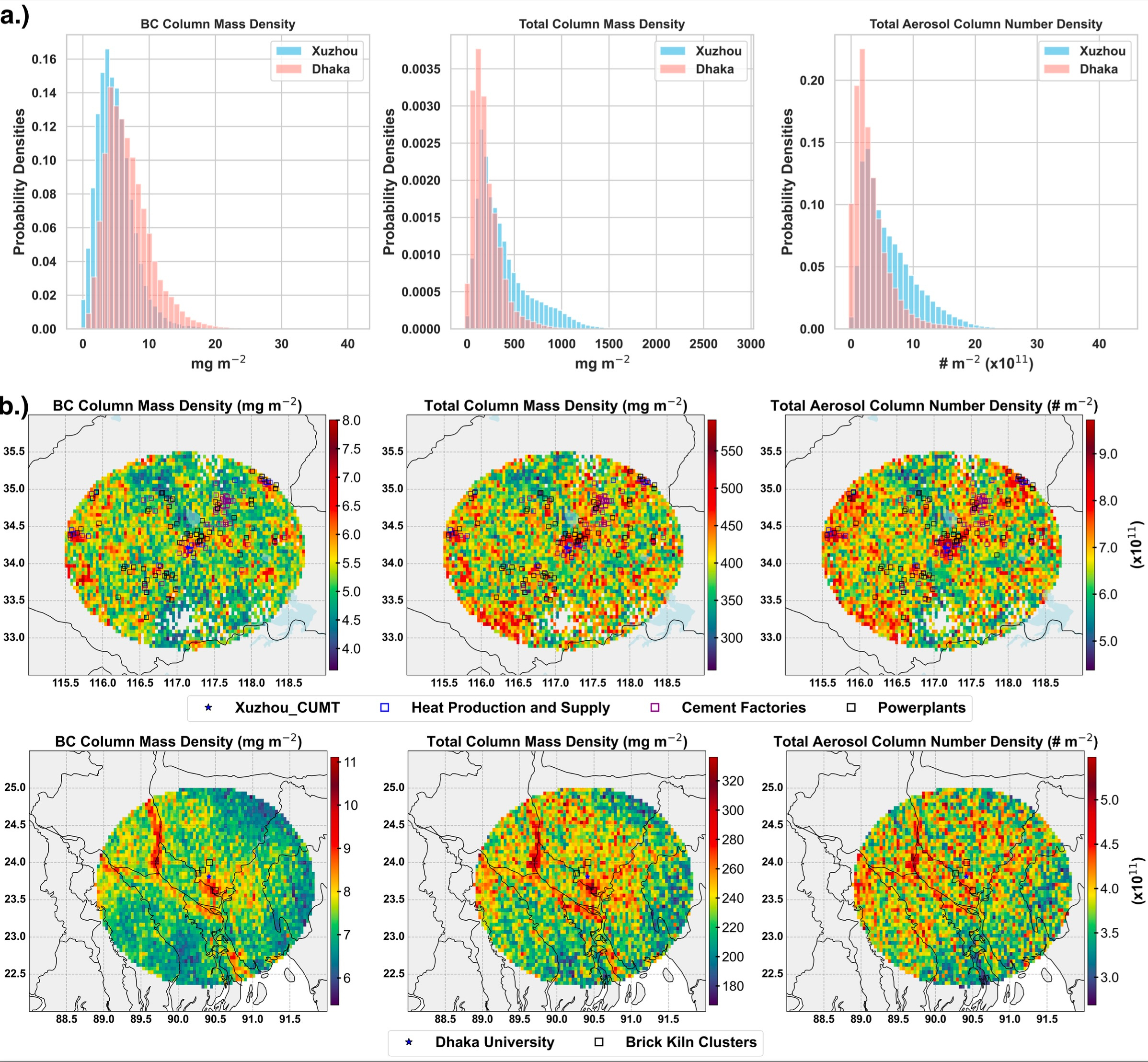 Next, this study developed high-resolution black carbon (BC) column products at a 5.5 × 3.5 km resolution, revealing distinct patterns of BC distribution across Xuzhou and Dhaka. While Dhaka exhibited higher BC column mass density, reflecting intense local emissions from brick kilns, biomass burning, and small-scale industries, Xuzhou recorded higher total aerosol mass and number densities. These contrasting patterns highlight Dhaka’s localized emissions and Xuzhou’s complex mix of industrial sources and transport.