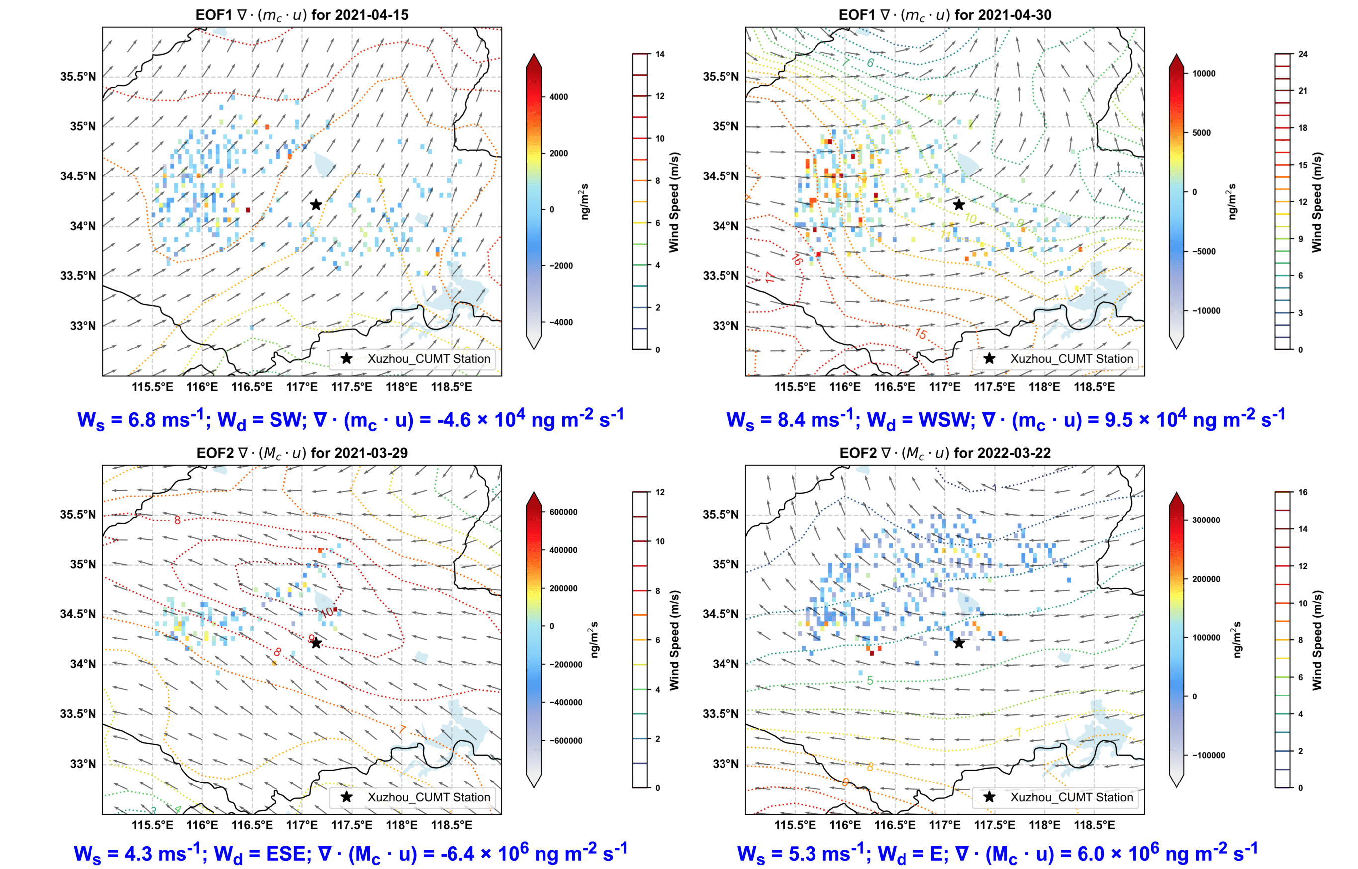 Each panel shows the combined wind and divergence data for a specific day, illustrating how high wind speeds, despite similar directions, lead to diverse patterns of pollutant accumulation and dispersion across the urban area.