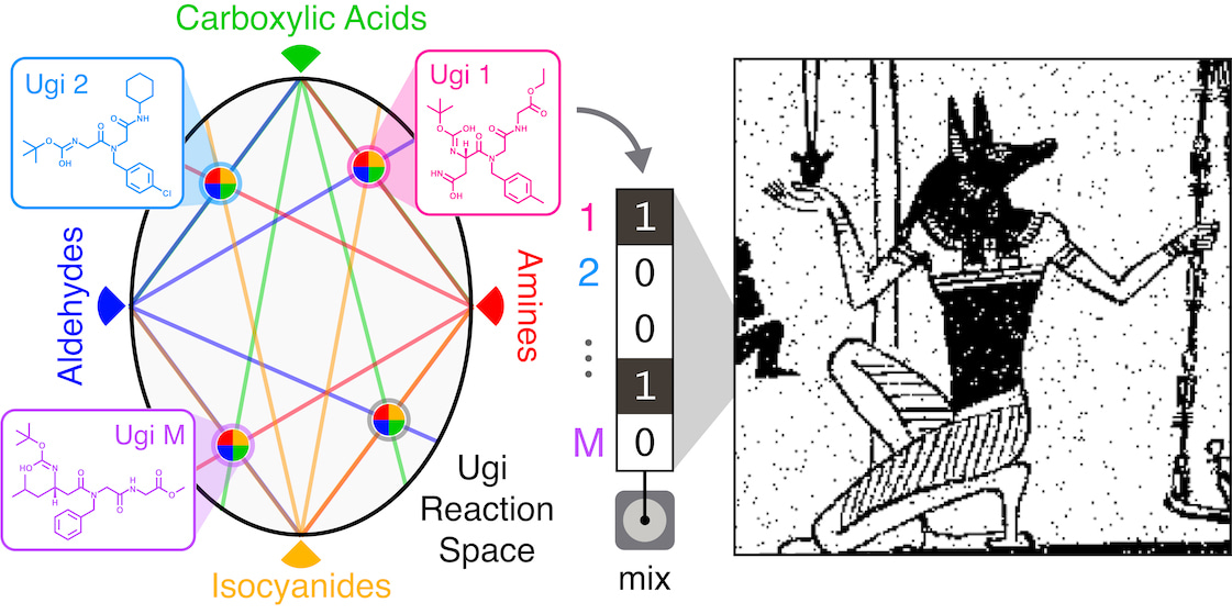 The molecules for these datasets are synthesized with Ugi reactions, which merge four chemical components into one product. By mixing a few types of each component, we can create thousands of unique molecules from only a handful of starting materials. We then write data by using a robot to spray tiny droplets of these Ugi molecules into hundreds of unique mixtures. Later, we read the data using a mass spectrometer, which separates the molecules in a mixture by their masses. To boost the accuracy, we pair our readout with some common machine learning tools to decode the mass spectra. Using this system we wrote and read digital images of several pieces of art, including a Cubist drawing by Picasso.