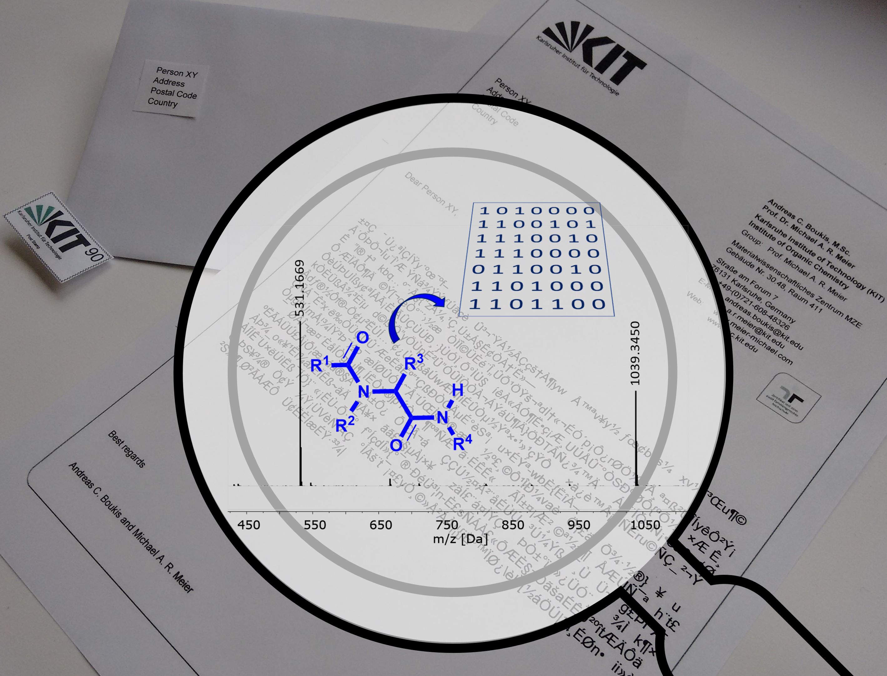 The laboratory of Professor M. A. R. Meier from the institute of organic chemistry at KIT (@AK_Meier) recently introduced a secret communication system based on so-called molecular keys (https://rdcu.be/LkgH). The basic idea to communicate via chemicals can be found in nature, e.g. in pheromones, and was also exploited previously in secret inks. However, in the present work, the authors report a fully synthetic system based on multicomponent reactions (namely the Ugi four component reaction). The molecules are employed as hidden “passwords” for the decryption of confidential messages or data contains of any size. In principle, every given set of data can be encoded independently using a secure algorithm and the respective password is encoded into a molecular key. Today’s cryptography algorithms can be considered as unbreakable (with the current computing power), but in many cases the password is the most vulnurable part of the whole system. You now might remember those annoying messages from your E-mail provider asking you to change your password. And if you do so, in many cases the following messages appears: Your password is not secure enough, not long enough, contains to less capital letters, special characters, etc.