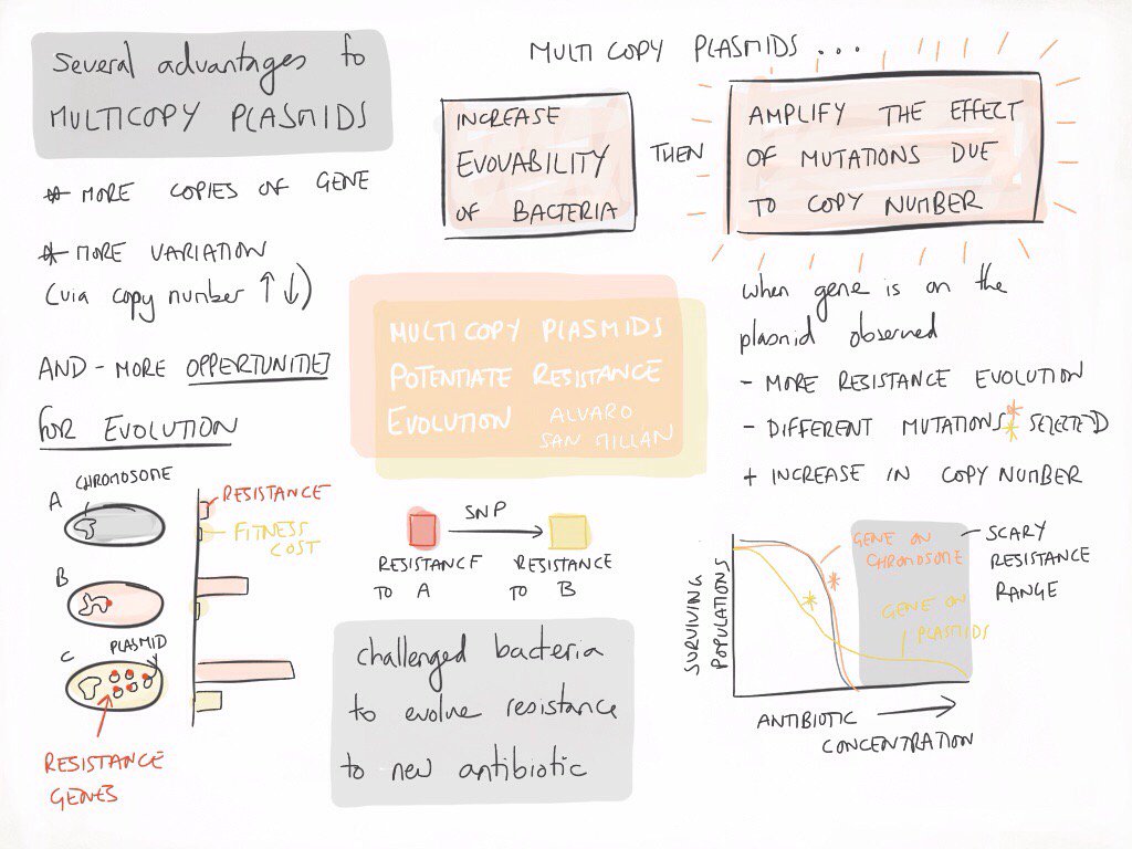 We decide to experimentally test what are the advantages for the host bacteria when a gene is located on a multicopy plasmid instead of on the chromosome. To answer this question we constructed a model system using Escherichia coli carrying the β-lactamase gene blaTEM-1 either on the chromosome or on a multicopy plasmid with approximately 20 copies per cell (pBGT). We analysed the advantages and disadvantages associated to each gene location in terms of antibiotic resistance and fitness levels, and we use experimental evolution and whole genome re-sequencing to investigate the evolvability of ceftazidime resistance in the different populations carrying blaTEM-1 (see attached image, courtesy of Ellie Harrison).