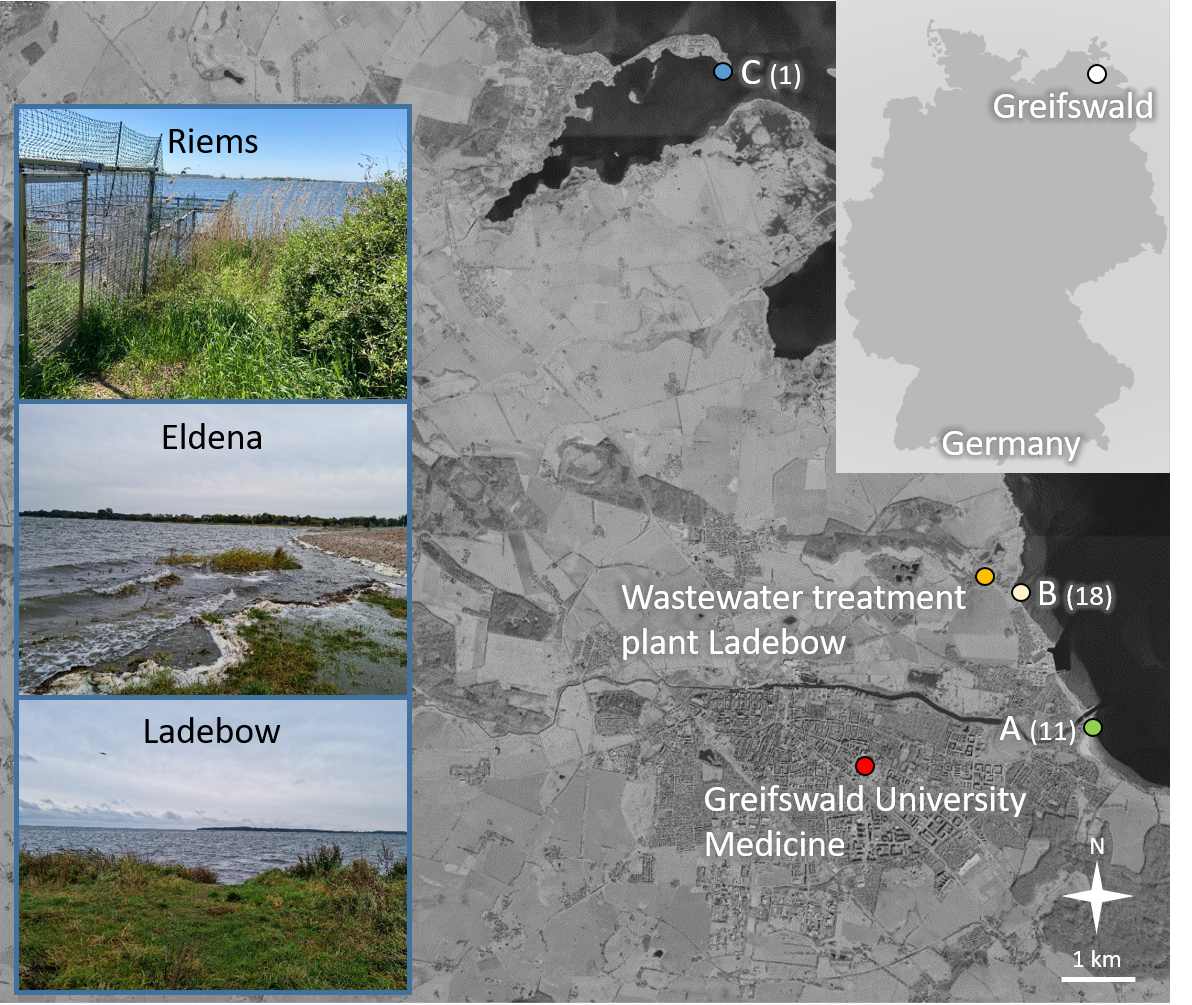 While there have been studies on the presence of multidrug-resistant (MDR) bacteria in certain water bodies, data on the Baltic Sea, which is significantly impacted by human activity, remains scarce. To address this gap, we investigated the surface water at various coastal locations near Greifswald (Germany) for the presence of MDR E. coli. Sampling took place over a year, from August 2021 to August 2022, and included three sites: (i) a recreational beach in Greifswald, (ii) an area close to the local wastewater treatment plant discharge, and (iii) a more rural spot on the island of Riems (Figure 1). Our goal was to analyze the isolated strains for phenotypic and genotypic traits, including resistance to antibiotics and heavy metals/metalloids that potentially co-select for AMR, virulence factors, and plasmids. Additionally, we quantified residues of five clinically used antibiotics to explore any potential link between antibiotic residue levels and the presence of resistant E. coli.