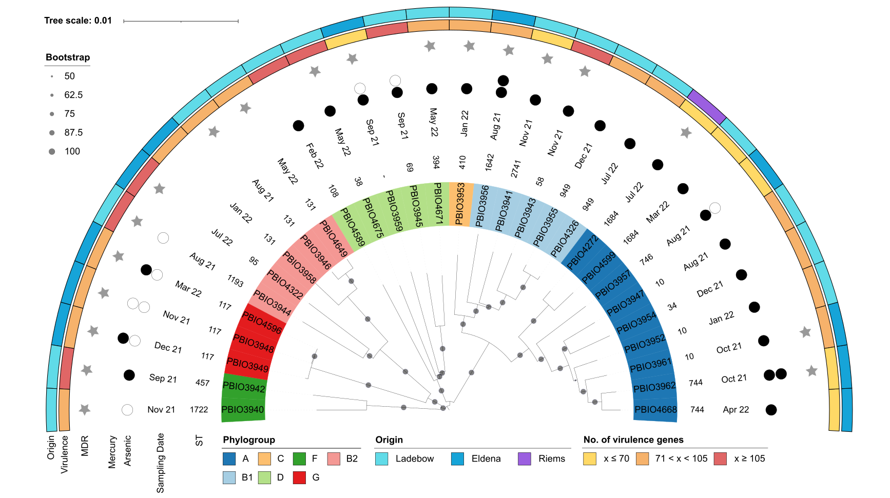 Figure 2: Mash distance analysis of the 30 ESBL-producing E. coli strains. Labels indicate the strain number and are colored according to their phylogroup as indicated in the legend. Annotations indicate (from inner to outer circle): sequence type (ST), sampling date, tolerance to arsenic and mercury, multidrug-resistant (MDR) phenotype, number of virulence-associated genes, and sampling spot. The extent of heavy metal tolerance is shown as circles, with no circles indicating low tolerance (arsenic, ≤8 µg/mL; mercury, ≤8 µg/mL), white circles indicating medium tolerance (arsenic, 256 µg/mL; mercury, 16 µg/mL), and black circles indicating high tolerance (arsenic, ≥512 µg/mL; mercury, ≥32 µg/mL).