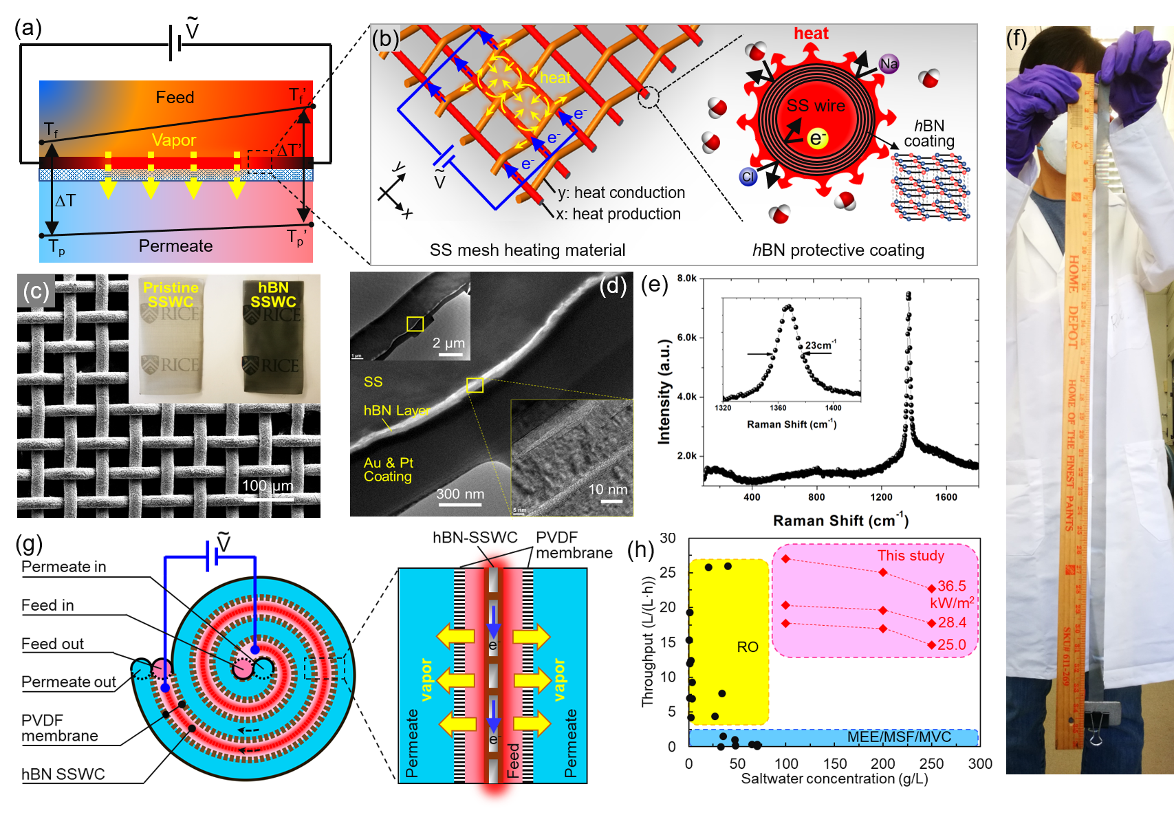 In this study, we used a hexagonal boron nitride (hBN) coated stainless steel wire cloth (SSWC) to electrically heat the feed stream at the membrane/feed interface (Figure 1a, b). The SSWC is porous (Figure 1c), flexible, robust, low-cost, and has microscopically uniform high thermal and electrical conductivity. The hBN nanocoating has excellent thermal conductivity and chemical stability; it is also electrically insulating and impermeable (Figure 1b, c, d, e). It provides a perfect chemical and electrical barrier while allowing fast heat transfer. As such, the hBN coated SSWC (hBN@SSWC) can provide high electrothermal energy intensity (e.g., 50 kW/m2) and be highly resistant to chemical and electrochemical corrosion under hypersaline conditions (up to 300 g L-1 NaCl). When attached to a commercial PVDF membrane, hBN@SSWC enabled high performance desalination of hypersaline water with a power source of household frequency (50 Hz), simultaneously producing the highest reported module-scale water flux, single-pass water recovery, heat utilization efficiency, and a near-saturated brine.