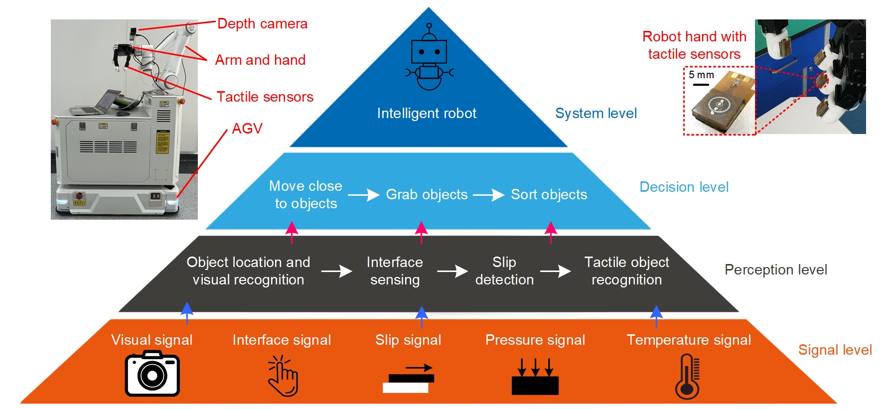 Fig. 4: A tactile-visual fusion robot architecture, including signal level, perception level, decision level, and system level.