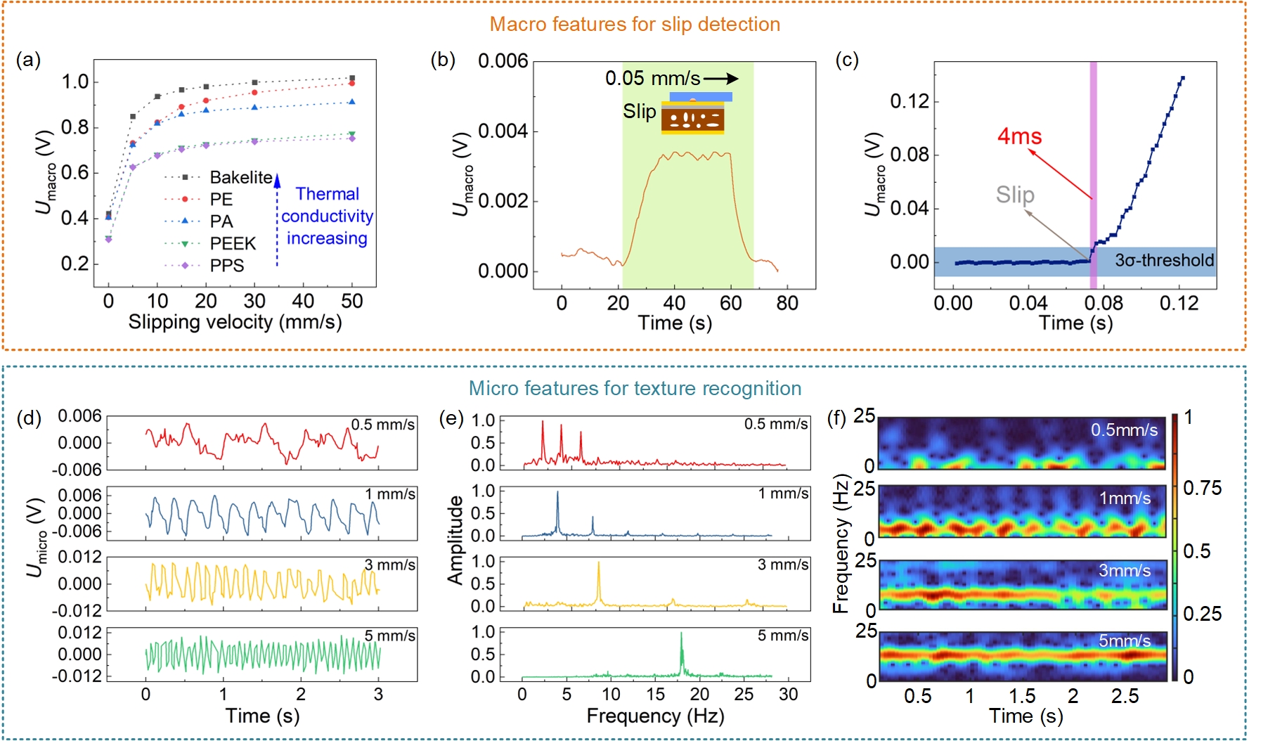 Fig. 3: (a) Macro features for different materials at different slipping velocities. (b) The tactile sensor has a low detection limit of 0.05 mm/s for slip detection. (c) The tactile sensor has a fast response time of 4 ms for slip detection. (d) Micro features at different slipping velocities. (e) FFT analyses of the micro features at different slipping velocities. (f) FFT analyses of the micro features at different slipping velocities.