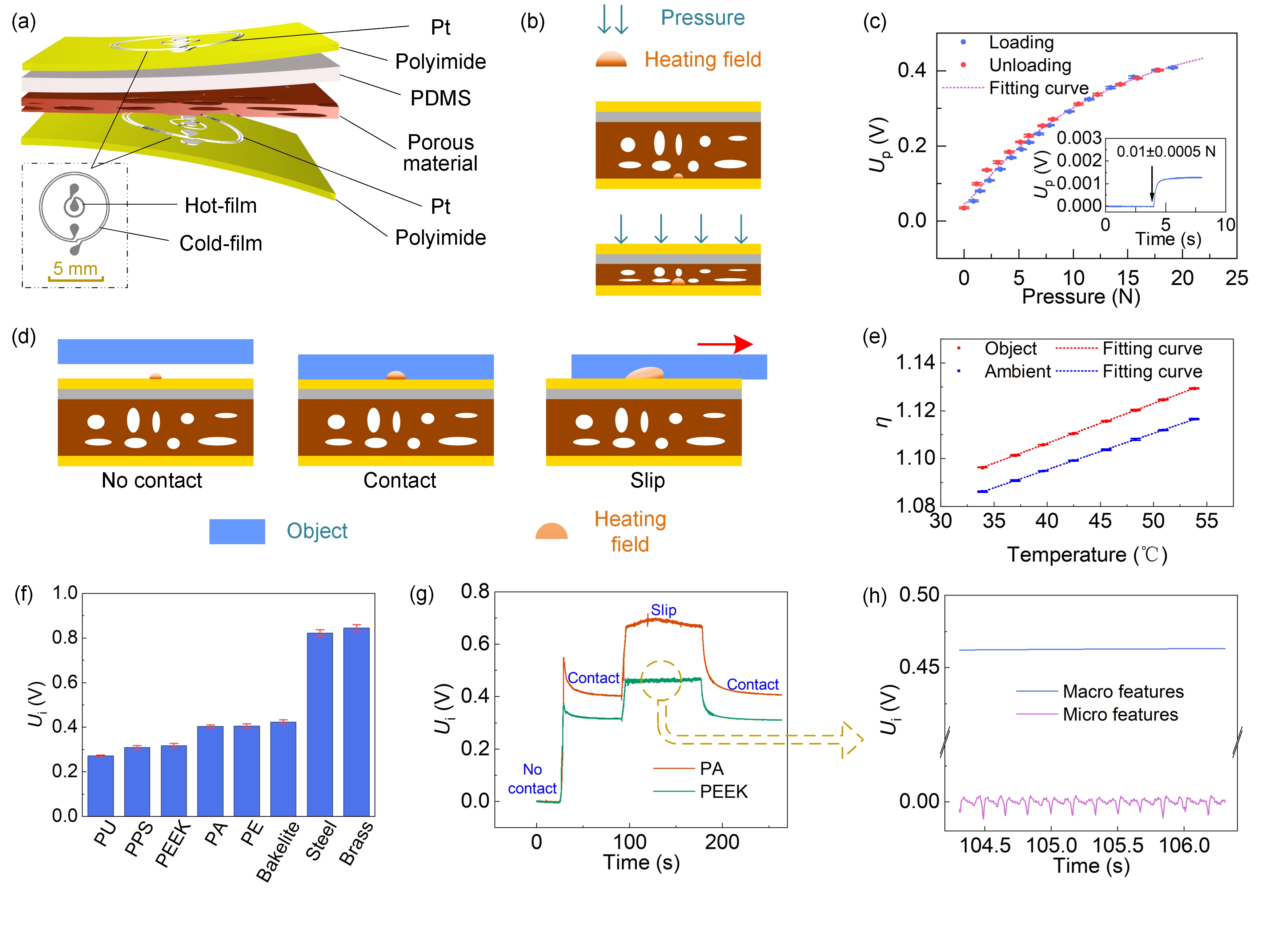 Fig. 2: The structure, working principle, and functions of the multimodal tactile sensor. (a) The structure of the tactile sensor is composed of a top sensing layer, a bottom sensing layer, PDMS, and a porous material in the middle. (b) Working principle of the bottom sensing layer. (c) The pressure response of the tactile sensor. (d) Working principle of the top sensing layer. (e) The output signals of the tactile sensor responding to ambient temperature and object temperature, respectively. (f) The responses of the tactile sensor when touching on different materials (g) The responses of the tactile sensor when contacting with and slipping on different objects, respectively. (h) Slip and texture are detected from the macro and micro features of the tactile sensor signals.