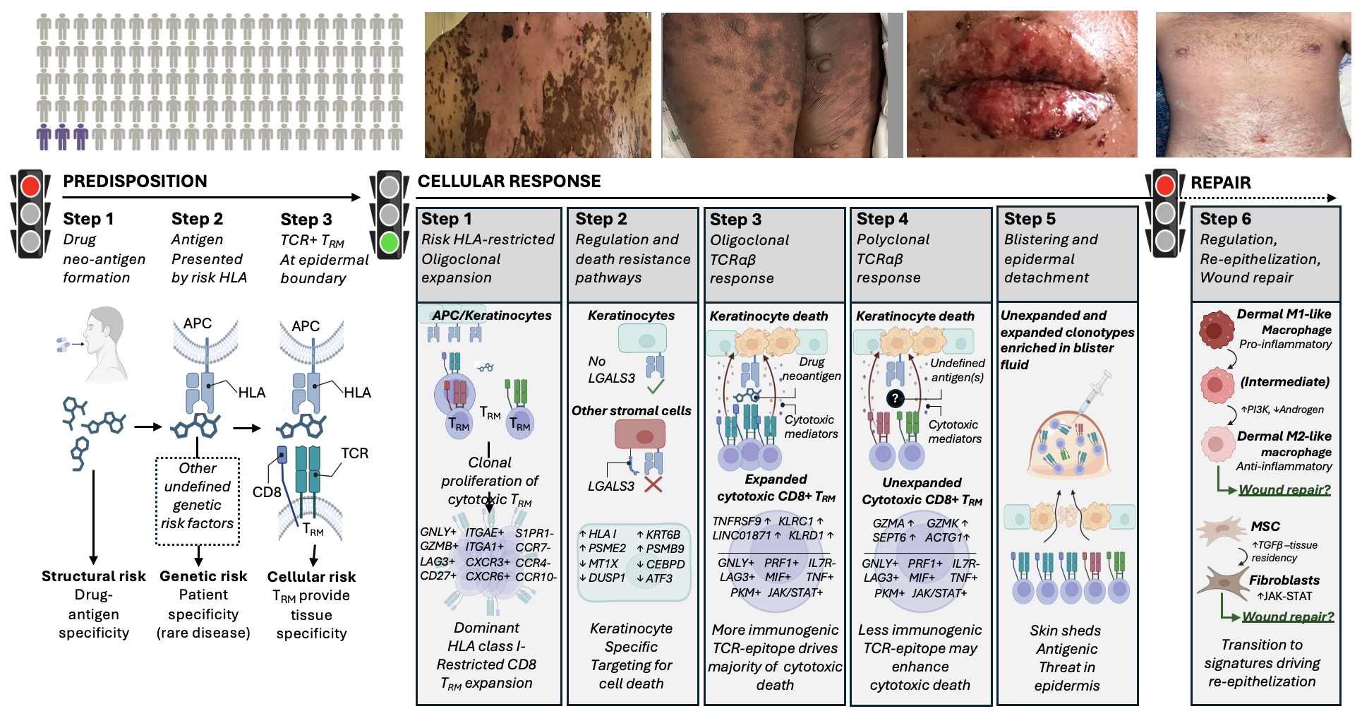 Severe skin conditions like Stevens-Johnson Syndrome (SJS) and toxic epidermal necrolysis (TEN) are life-threatening reactions leading to death in up to 50% or more of those they affect. They cause the skin and mucous membranes to blister and peel, leading to significant long-term complications like blindness, internal organ, reproductive and mental health complications. In adults these reactions are often triggered by medications, but until now, scientists had little understanding of how the immune system creates such devastating effects.