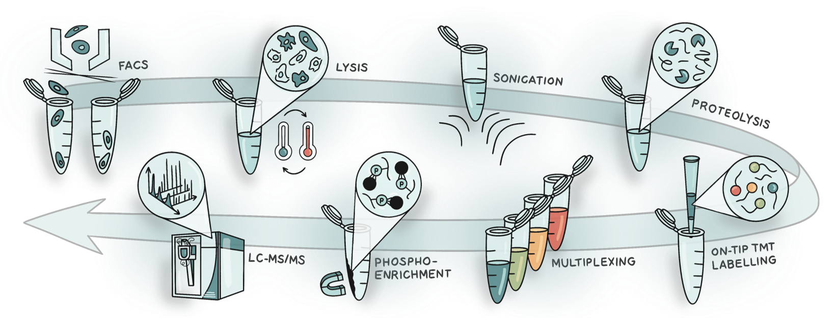 Figure 1. Schematic of the SPARCE workflow. Cells are isolated using FACS and subjected to lysis by freeze-heat cycles and sonication. Proteins are digested, and peptides are labelled and desalted on the same tip. Labelled samples are multiplexed, and phosphopeptides are enriched for LC-MS/MS analysis.