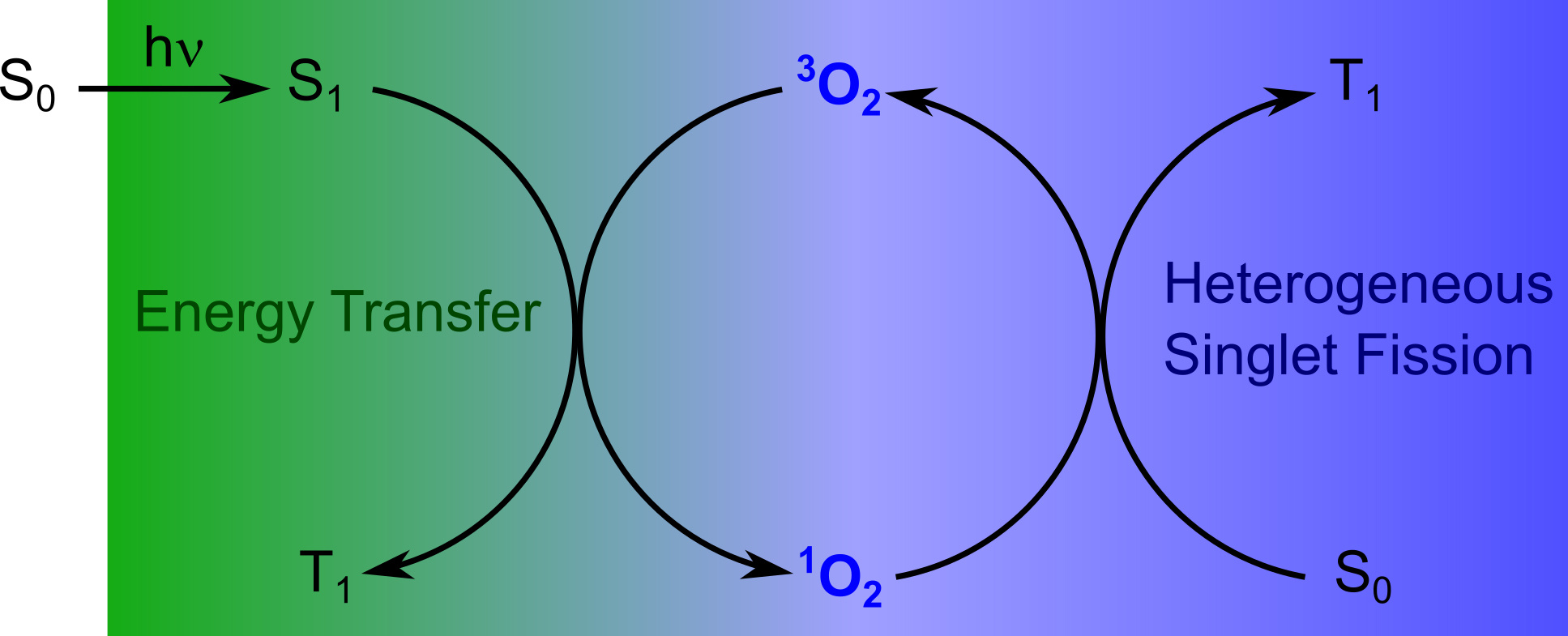 In order to understand the intricacies of the underlying mechanism, a look at the electronic configuration of molecular oxygen is necessary. In its ground state, it has two unpaired electrons which constitutes a triplet state (3O2). Its first excited singlet state (1O2) is located only 0.97 eV higher in energy. Thus, an organic chromophore with a sufficient S1 ‑ T1 energy gap is able to sensitise oxygen, resulting in a triplet exciton and 1O2. Subsequently, the latter interacts with a ground state chromophore. This second step regenerates 3O2 and produces an additional triplet exciton. In total, the reaction balance is exactly the same as for a bimolecular singlet fission process. This sequential singlet fission mechanism can be applied to a variety of chromophores, as long as they possess suitable S1 and T1 energy levels.