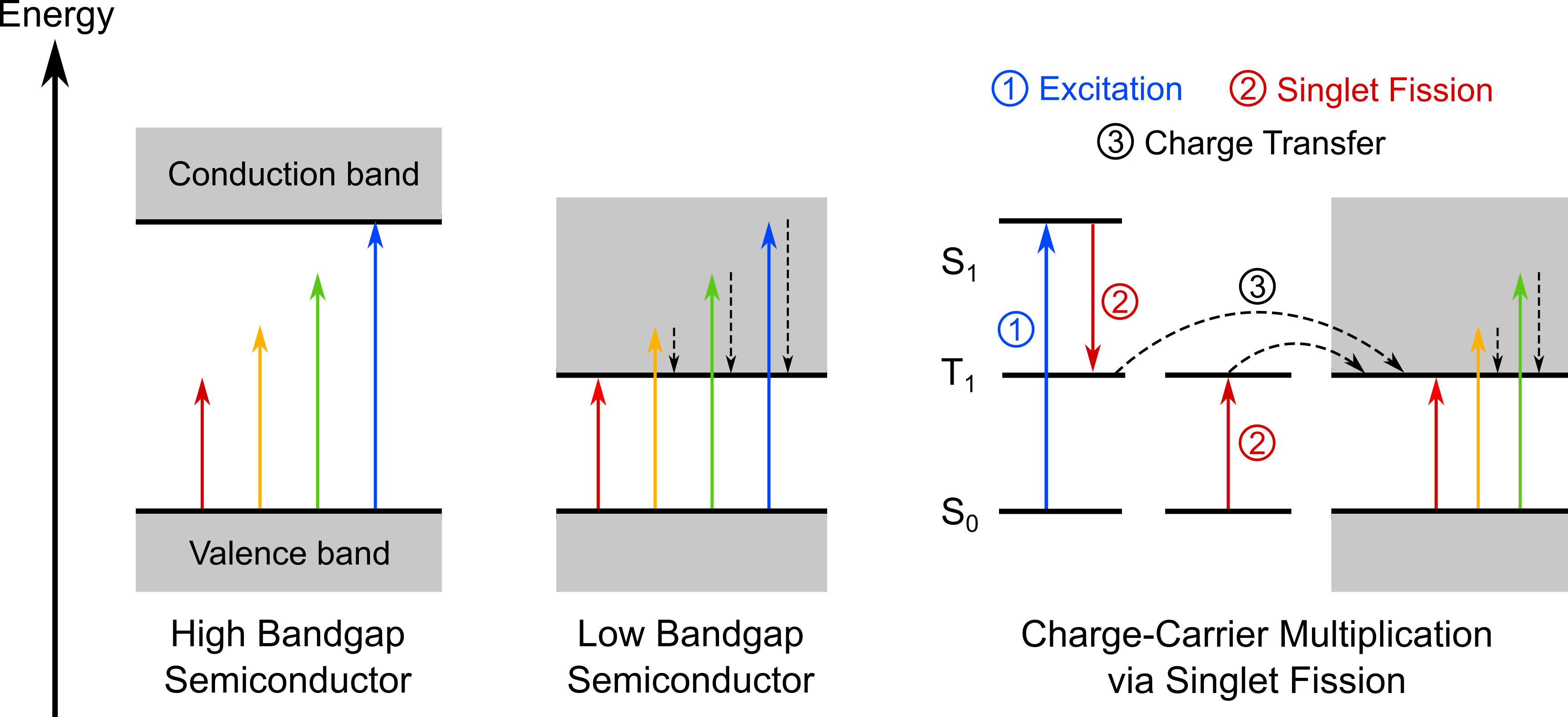 Figure 1: In high bandgap semiconductors (left) low-energy photons are not able to promote electrons from the valence to the conduction band. In low bandgap semiconductors (centre), high-energy photons result in energy wasted as heat. Charge-carrier multiplication processes like Singlet Fission (right) convert one high-energy photon to two low-energy charge carriers which can be injected into the semiconductor.