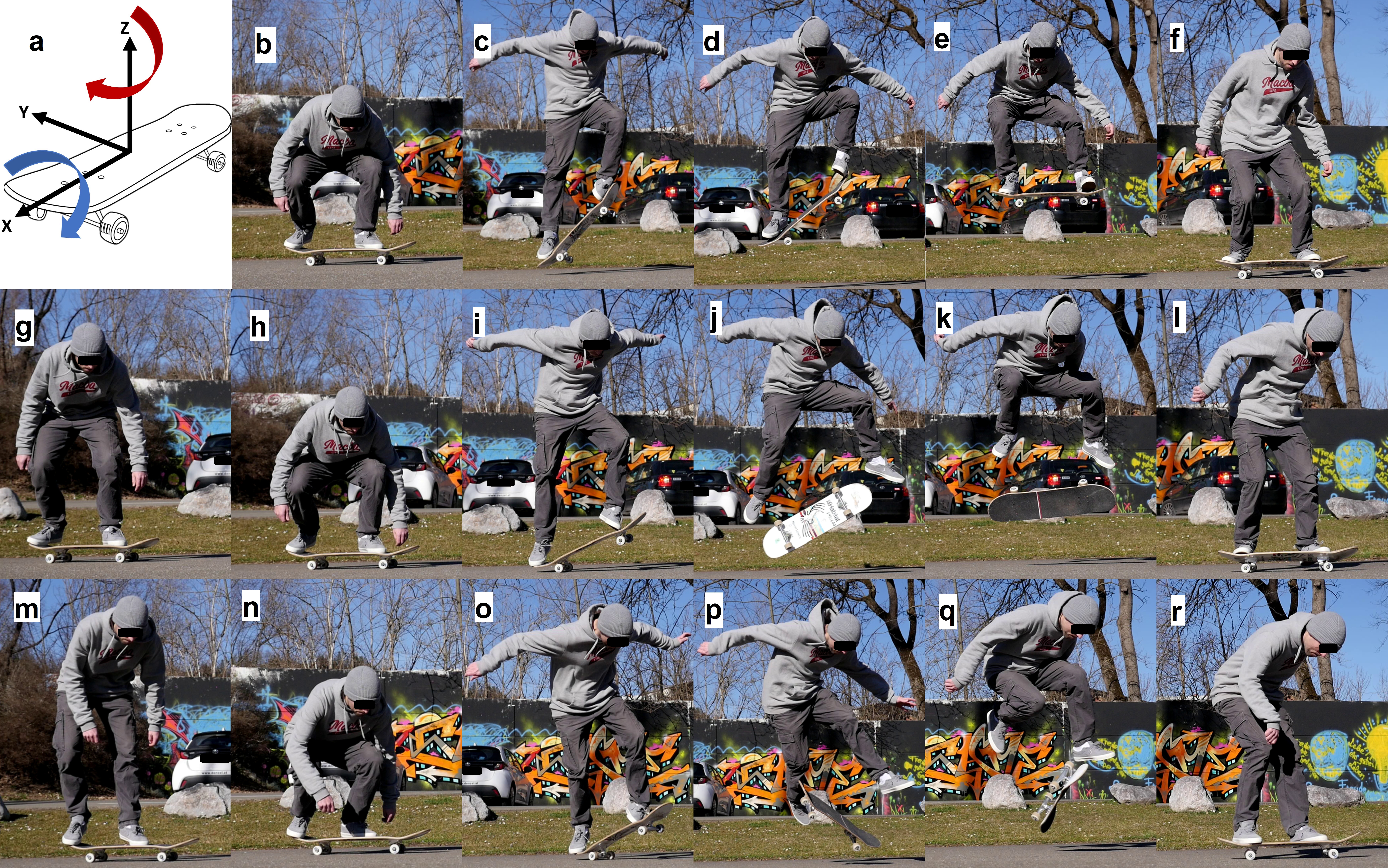 Figure 1: a: The Ollie is a basic jump with the skateboard without any rotation of the board. The board performs a 360° rotation around the x-axis (longitudinal axis) during a Kickflip, and a 360° rotation around the x- axis and the z-axis (vertical axis) during a 360°-flip; b – f: Ollie; g – l: Kickflip; m – r: 360°-flip; the analyzed time frames were between the lowest (b, h, n) and highest (e, k, q) point of a sacrum cluster marker.