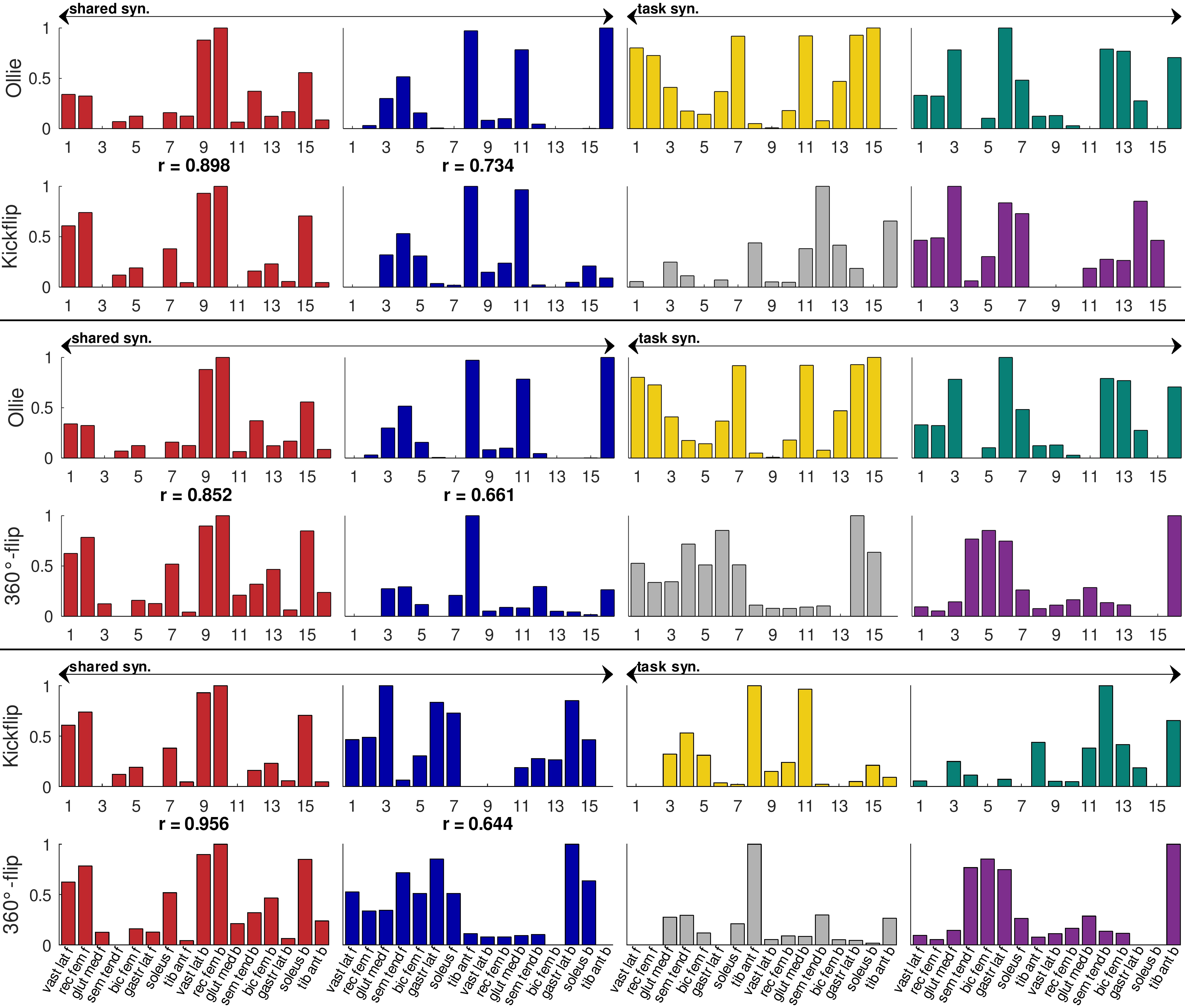 Figure 2: Shared and task-specific synergies between every two tricks for one example participant; r = Pearson’s correlation coefficient; y-ticks indicate the muscle weight, x-ticks indicate the muscles for the front (f, muscle 1-8) and back (b, muscle 9-16) leg.