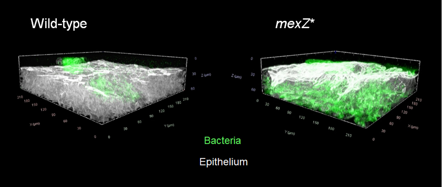 We investigated the colonization strategy of a mexZ mutant by using an in vivo-mimicking human airway epithelium infection model, revealing this mutation to induce changes in the infection behaviour of this bacterium. Notably, the mexZ mutant displayed enhanced tissue invasion capabilities, leading to an increased intraepithelial colonization. We observed that this behaviour confers protection from antibiotic eradication, as the intraepithelial compartment is impermeable to many antibiotic classes. This change in colonization and associated shielding from treatments may potentially explain the high frequency of mexZ mutations in clinical isolates from early timepoints of infection, since it could be contributing to treatment failure and persistence of P. aeruginosa infections.