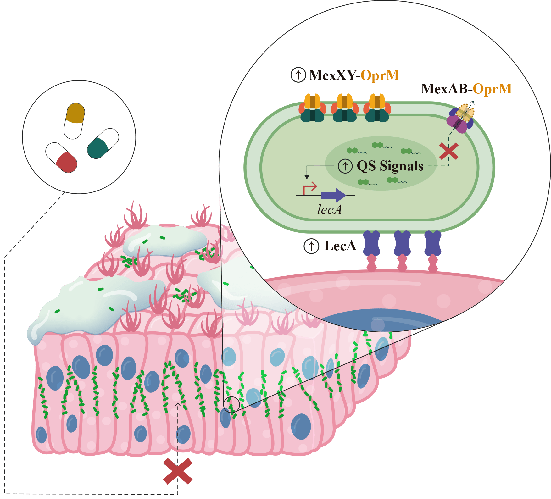 Additionally, our study elucidates the molecular mechanism underlying this intriguing phenotype associated with mexZ mutations. The overproduction of the MexXY-OprM efflux pump collaterally disrupts QS signalling, resulting in the upregulation of lecA, a QS-regulated gene encoding a lectin crucial for P. aeruginosa attachment to human tissues. This is rooted in the competitive dynamics for the porin OprM, shared by MexXY and MexAB efflux pumps, being the latter involved in the extrusion of QS signals. The mexZ mutation-associated overproduction of MexXY-OprM reduces the amount of MexAB-OprM, altering the extrusion of QS signals through this efflux pump.