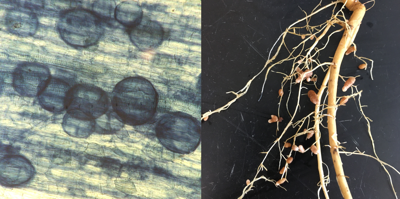 Mycorrhizal fungi (arbuscular) colonizing plant roots (left) and root nodules formed with a major group of N-fixing bacteria: rhizobia (right; picture from Susan Magnoli).