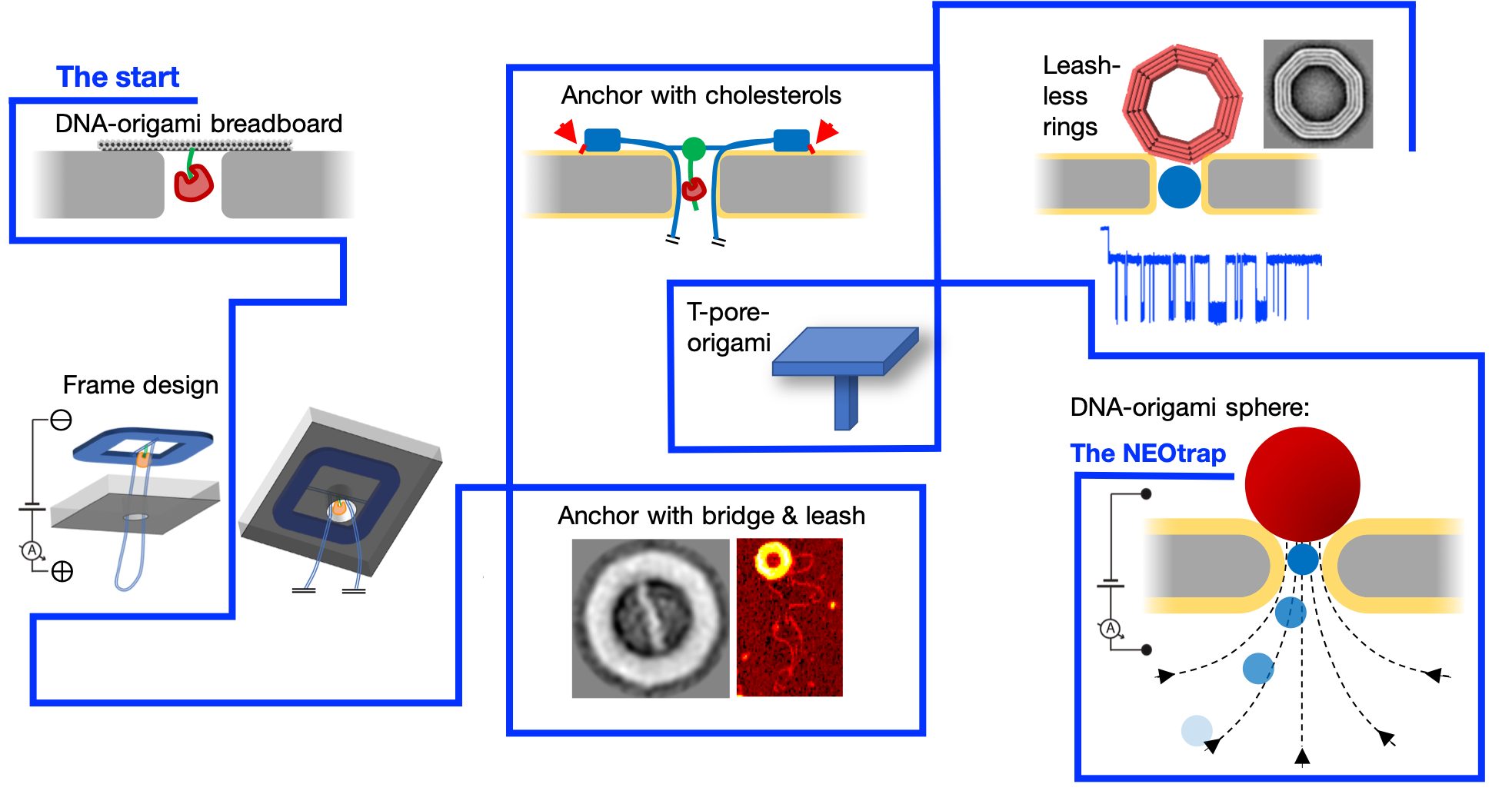 Figure 2: The road to the NEOtrap was a winding one with many lessons learned along the way. Micrograph image credits: Hendrik Dietz lab and Cees Dekker lab/Allard Katan.