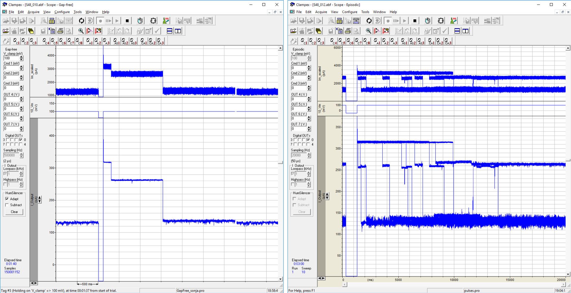 Figure 3: The eureka moment: original screenshots of the first NEOtrap data (Clampex software, Molecular Devices). Left: a single trapping event with the characteristic three current levels: (i) open-pore baseline, (ii) docked origami, (iii) trapped protein. Right: an overlay of ten docking and trapping events shows remarkably uniform current blockades.