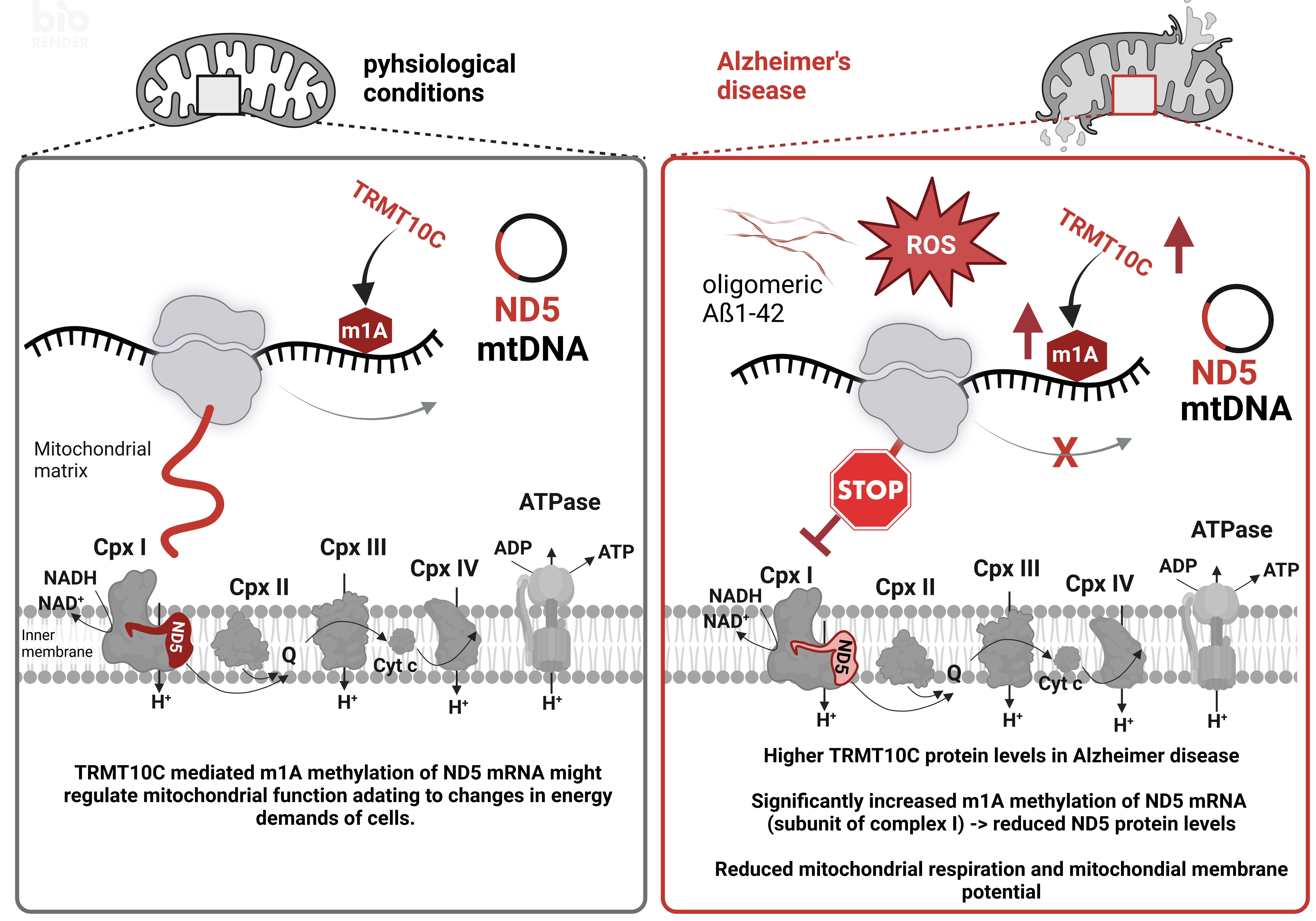 Using this broad set of models and methods, we provide first evidence that TRMT10C protein levels are increased in our AD cell model, in post-mortem tissue and RNA-Seq data from AD patients, plausibly leading to increased m1A methylation of ND5 mRNA. Importantly, TRMT10C mRNA levels are only elevated in inhibitory and excitatory neurons already at an early stage of the disease. Increased levels of methylated ND5 mRNA correlate with reduced ND5 protein levels in AD models and patients. Similarly, we demonstrate that TRMT10C overexpression in HEK293 cells results in increased m1A methylation of ND5 and reduced ND5 protein levels consequently leading to reduced mitochondrial function reflected in reduced respiration and mitochondrial membrane potential. This newly described mechanism driving mitochondrial dysfunction in AD is both driven by oligomeric Aß1-42 as well as oxidative stress. In addition, we are able to rescue ND5 protein expression HEK APPwt cells knocking down TRMT10C using siRNA, which also reduces m1A levels in these cells.