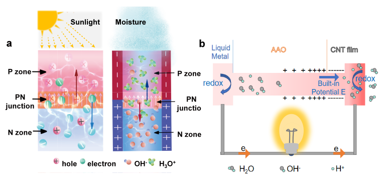 As shown in Fig. 1a, inspired by the form of the semiconductor PN junction in photovoltaic device, we propose a humidity-enabled electric generator (HEEG) device by adopting ionic diode–type PN junction in moist air. This diode-type PN junction exists at the interface of the carbon nanotubes (CNT) films and anodic aluminum oxide (AAO) membrane. As shown in Fig. 1b, the built-in electric field of the nanofluidic diode-type PN junction helps the selective ions separation and the steady-state one-way ion charge transfer. This directional ion migration is further converted to electron transportation at the surface of electrodes via oxidation-reduction reaction and charge adsorption, thus resulting in a continuous voltage and current with high energy conversion efficiency.