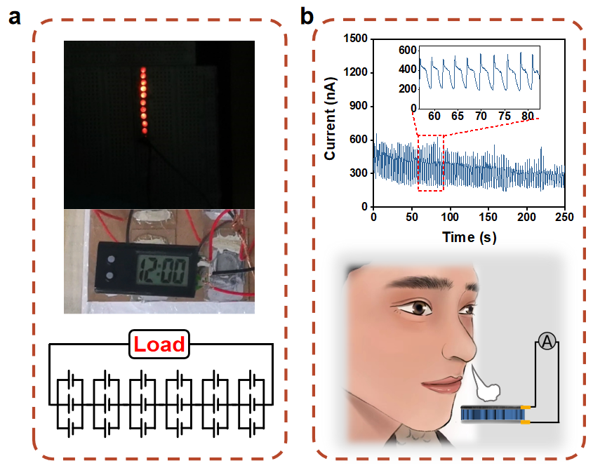 Fig. 2. Application of HEEG devices. a) Combination of 18 devices in series and parallel connection can light up ten LEDs and power up a digital electronic watch directly under laboratory environment ~65%RH, 25℃. b) Self-powered breathing monitoring application and its signal display, the bottom is the test schematic diagram.