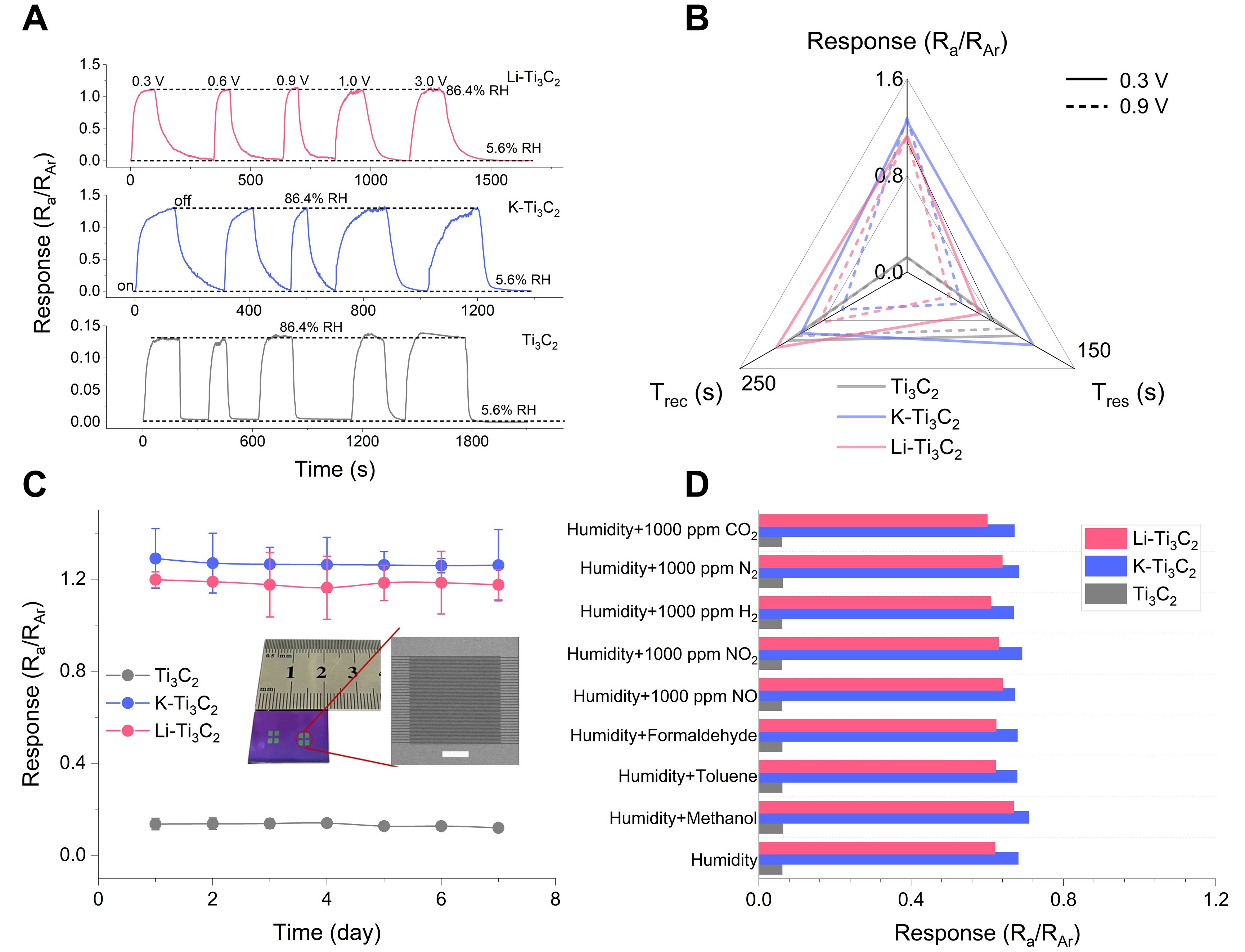 Inspired by the anomalous gating phenomenon, the samples were evaluated as sensitive materials for humidity detection to explore the nanofluidic sensing paradigm. The optical image in Fig. 2C shows a micro-scale sensing substrate based on our photolithography fabrication. Briefly, the manufacturing process involves the use of photolithography technology to create interdigital electrode patterns at the micron level on silicon wafers. Subsequently, non-conductive resin is transformed into glass carbon with desirable conductivity by subjecting it to high-temperature pyrolysis. The experiment results indicate that the K-Ti3C2 (1.27) and Li-Ti3C2 (1.12) have significant improvements in humidity responses, which are about 10 and 8 times higher than Ti3C2, respectively (Fig. 2A). This can be attributed to the introduction of metal cations which enlarged the effective interlayer spaces, allowing more water molecules to enter into the channel interior. Noteworthy that when the voltage increases from 0.3 to 0.9 V, the response and recovery speed of K-Ti3C2 (Response time: 113→49 s; Recovery time: 158→97 s) and Li-Ti3C2 (Response time: 65→38 s; Recovery time: 195→132 s) are greatly improved (Fig. 2B). Therefore, electric and ionic manipulations are promising methods for developing nanofluidic sensing applications.