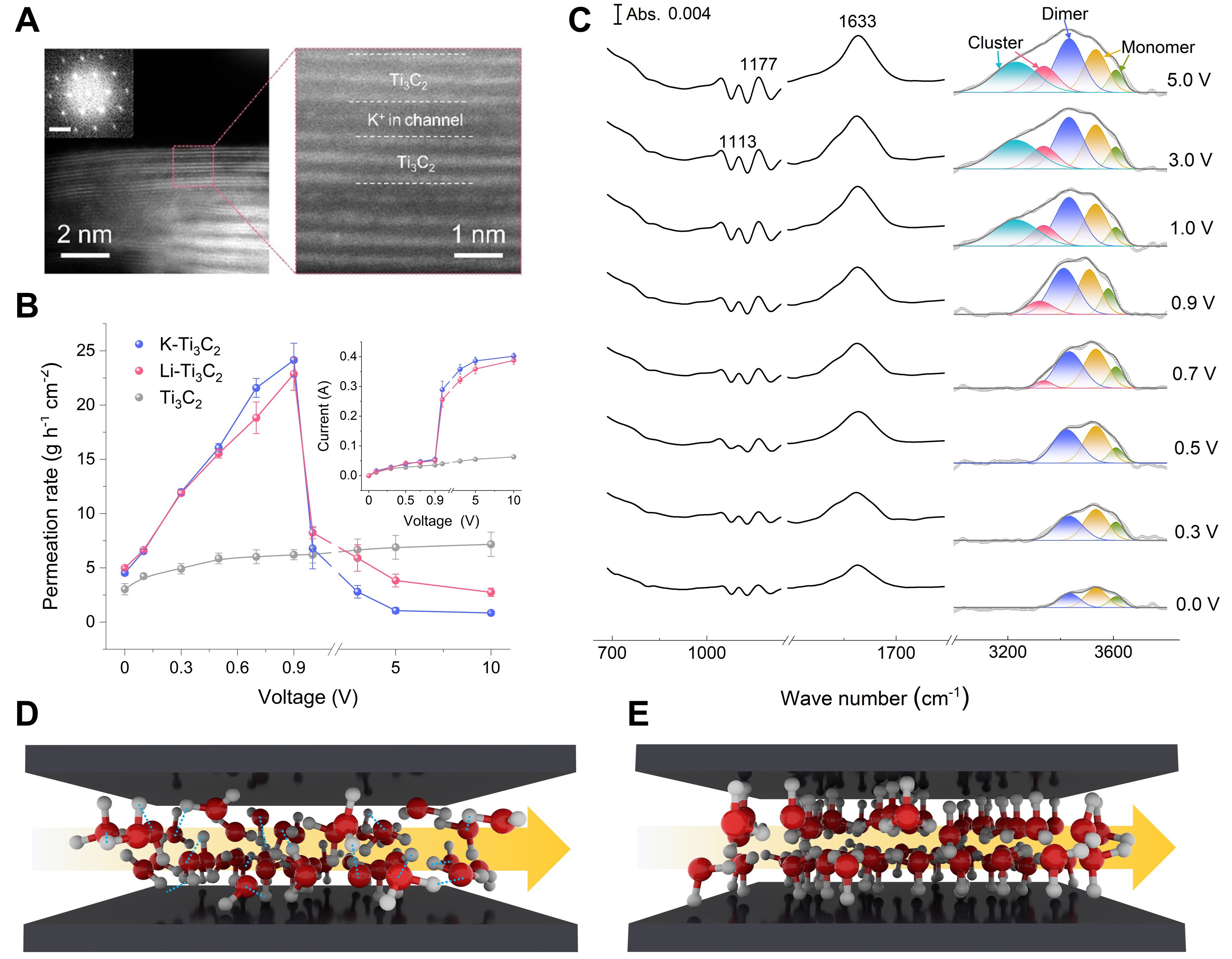In our newly published work,3 we chose a two-dimensional (2D) transition metal carbide (Ti3C2 MXene) with unique layered structures as the research template of water molecules transport in confined spaces and proposed the concept of combining cations and electric factors to address the above key challenges. This strategy enables to rapidly regulate the permeation rate of controlled water on the metal cation-intercalated Ti3C2 (K-Ti3C2 and Li-Ti3C2) membranes, which is attributed to the equilibrium transformation of confined water between three structural types caused by electric fields and cations: monomer ⇋ dimer ⇋ cluste. In 0 ~ 0.9 V, we found that an orderly denser arrangement of confined water caused by low currents that induced the polarization of water molecules results in a significant increase in water permeation rate with increasing voltage. Subsequently, the reduced free energy barrier of metal cations weakened the suppression of current, leading to a sudden change in current and a sharp decrease in permeability at ~ 0.9 V. The reason is that the high current drove the dissociation and agglomeration of confined hydrolysis into macromolecular clusters in 2D channels, hindering the flow of water molecules. Based on the findings, we developed a high-performance humidity sensor by simultaneously optimizing the response and recovery speeds through electric manipulation.