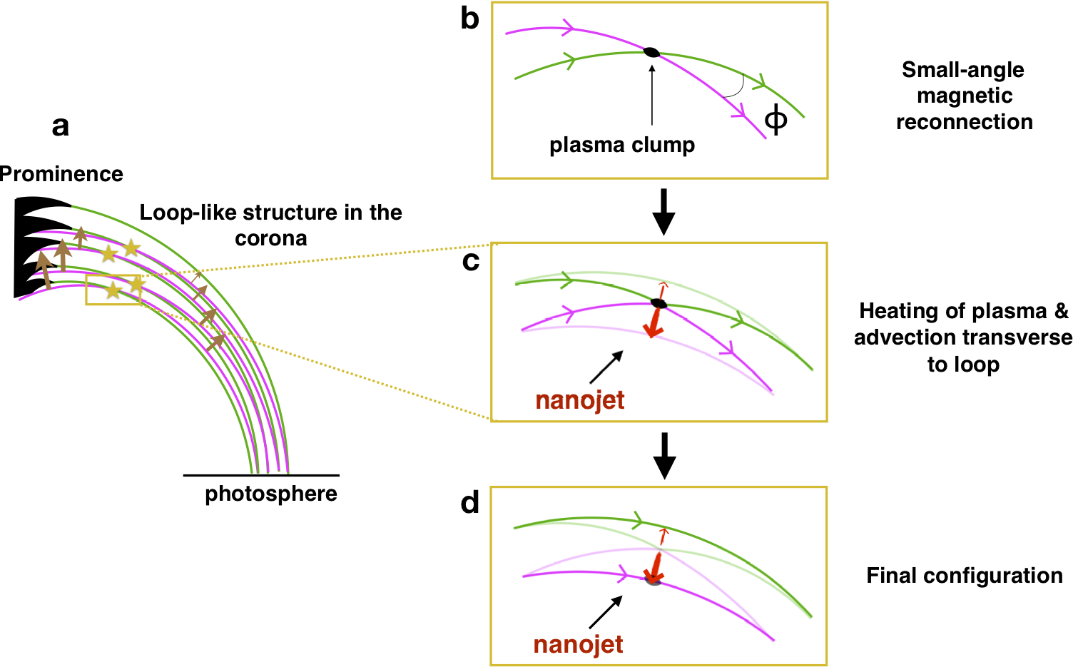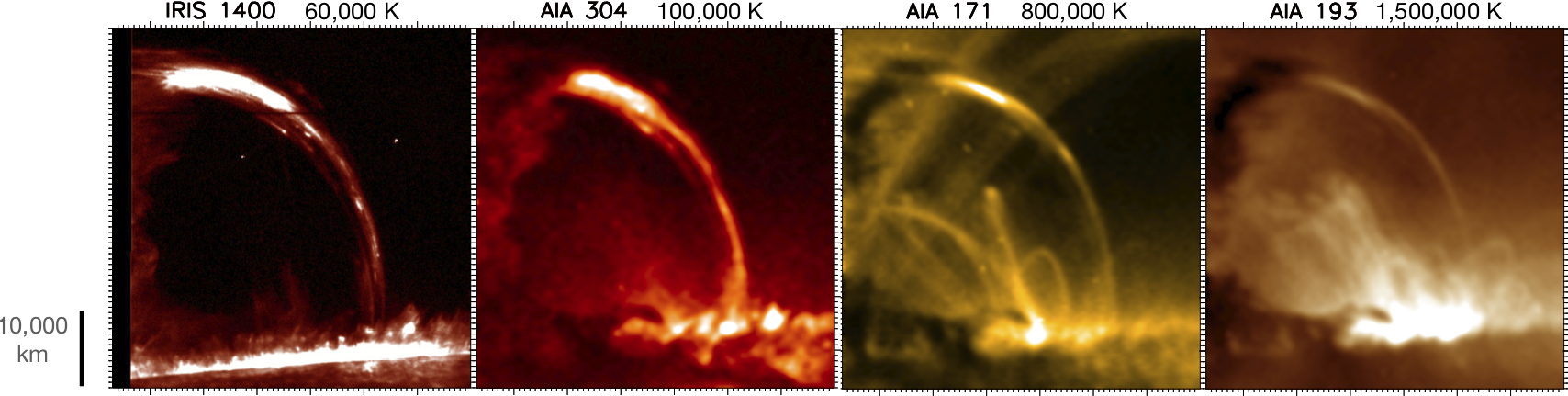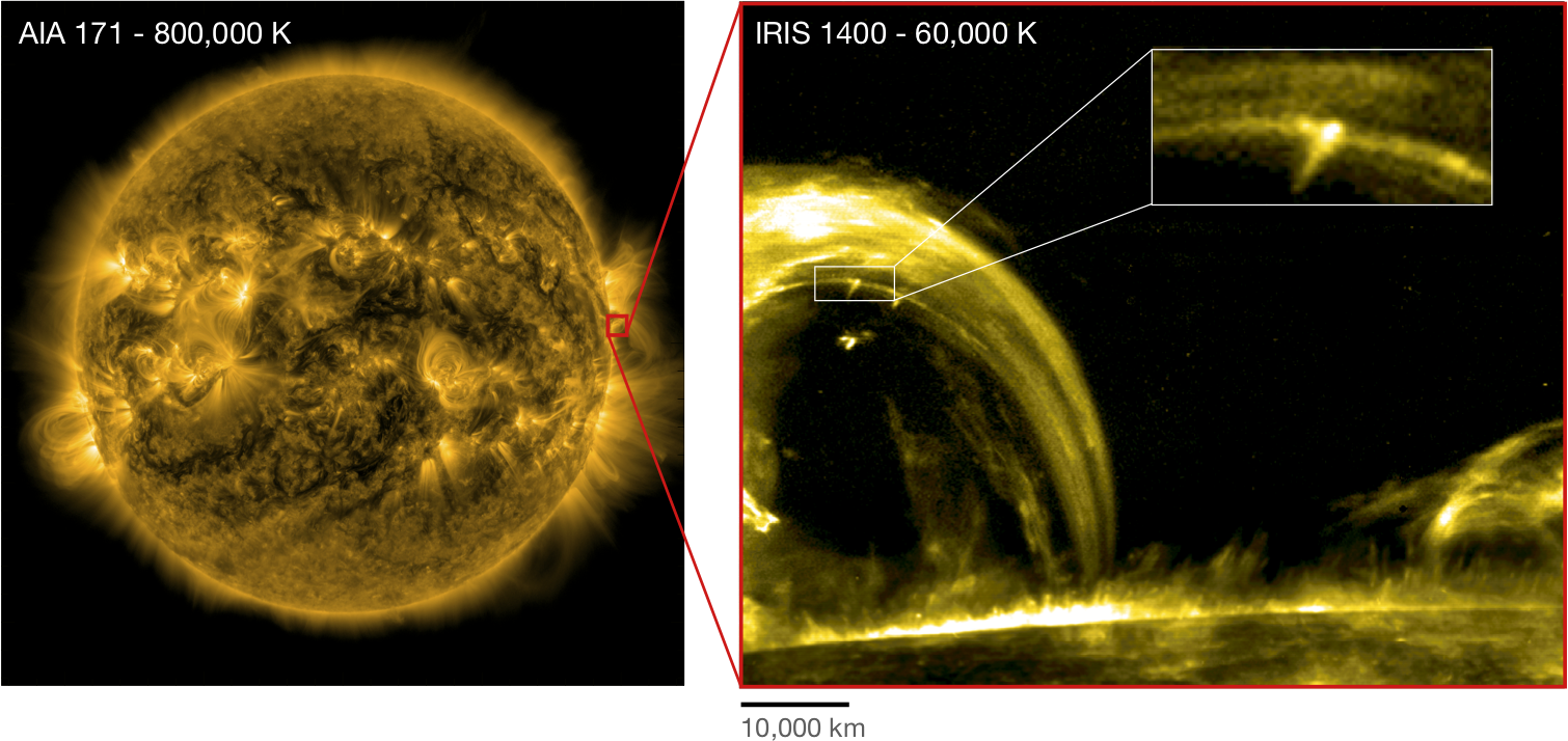 Imagine that you are taking a long exposure photo at night of a moving light or a star. What effect do you get? A segment of light, with a longer length for longer exposures or faster motion. Now imagine a bow with a light attached to the string and that after pulling back the string, you release it. In the context of the solar corona, the tensed string of the bow represents the magnetic field, and the bounce-back of the string represents the reconnection process. The field lines detangle due to reconnection and magnetic tension drives the reconnected field lines to a new equilibrium position. Since there is heating where the lines reconnect, the fastest moving part of the field line is the hottest, thereby leading to streaks of light: the “nanojets”. This is exactly what was discovered in this study with high resolution observations with IRIS, SDO and Hinode (all orbiting the Earth and constantly observing the Sun). As shown in Figure 1, and as in the bow comparison, the nanojets appear perpendicular to the direction of the magnetic field (the loop structure), being bright (with an energy in the nanoflare range), extremely short lived (order of 10 s), very fast (on the order of 100 km/s), with lengths of 1,500 km and widths of 500 km (see Figure 2 for a sketch of the process).