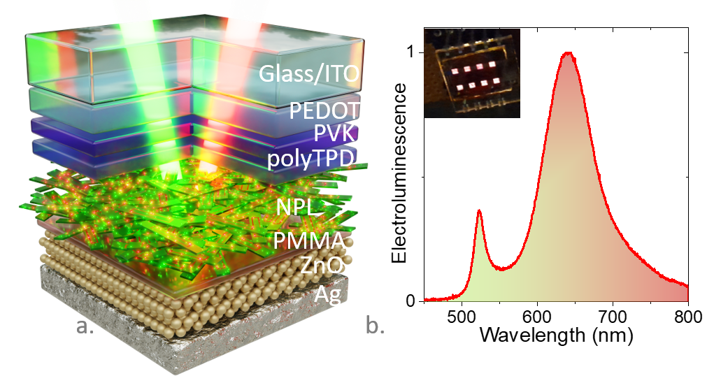 Finally, the authors demonstrate that these bicolor emission properties are not limited to optical excitation and can be also obtained from electroluminescence, see Figure 2b. To do so the bicolor NPLs have been integrated into a diode stack such as the one depicted in Figure 2a