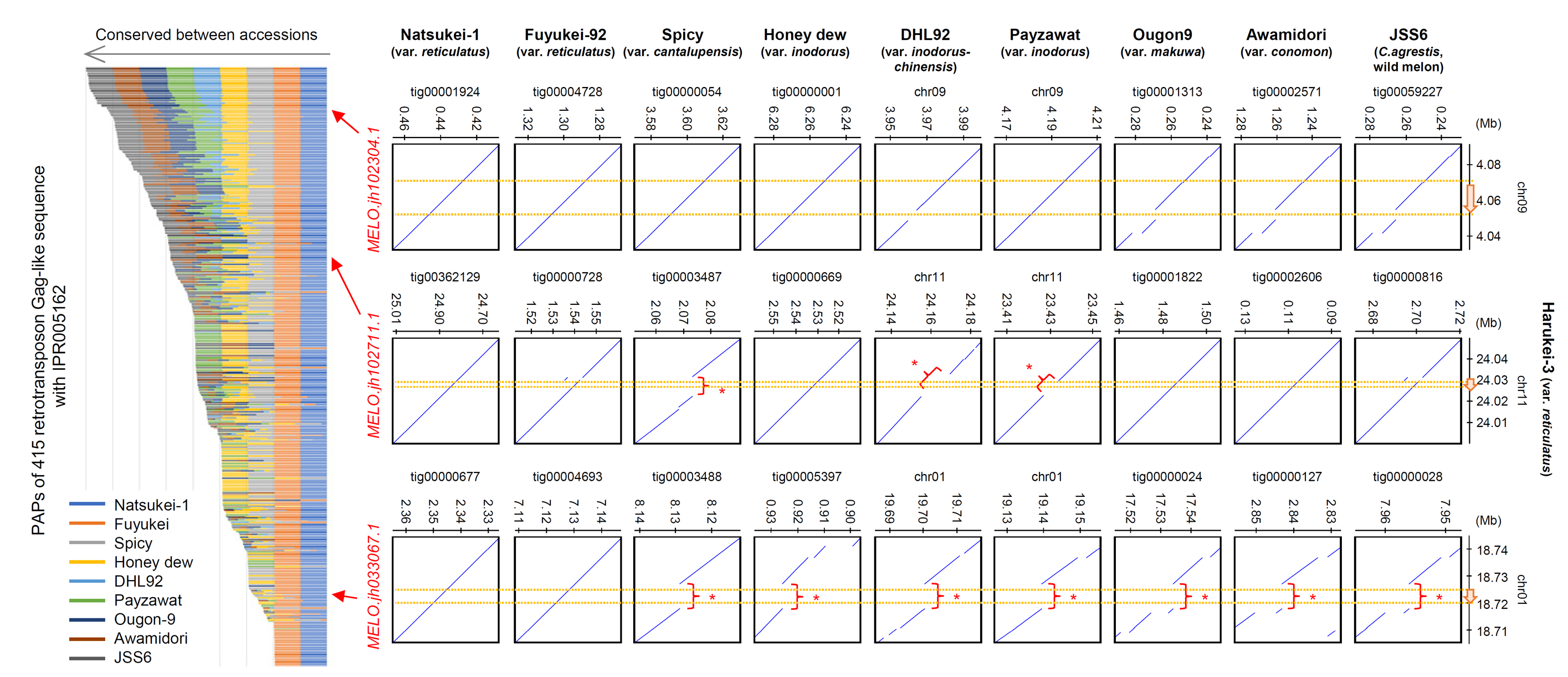 By using ONT for assembly of Harukei-3 melon, we assembled the 12 chromosomes of this melon genome with only 94 gaps (378 Mb in total). This high-grade genome assembly enabled construction of high-resolution tissue-wide RNA-seq atlas as well as detailed comparison with the previously published melon genomes. In our study, ONT also enabled contig assembly in additional seven melon accessions. Surprisingly, only one or two Minion flow cells were required for the analysis of each melon (in total nine flow cells used) although N50 varied 3.9 to 10.2 Mb. Our study demonstrated that these assemblies were enough to resolve structural genomic variation such as presence/absence polymorphisms (PAPs) (Figure 1). Indeed, we found genome-wide PAPs of retrotransposon sequences among melon accessions. Tissue-wide RNA-seq atlas showed that significant portion of such retrotransposon sequences were specifically transcribed in ripening fruits, with 59.4% of the neighboring genes showing similar expression patterns (r > 0.8). Taken together, we suggested that retrotransposons contributed to the modification of gene expression during diversification of melon genomes. It may also affect fruit ripening-inducible gene expression.