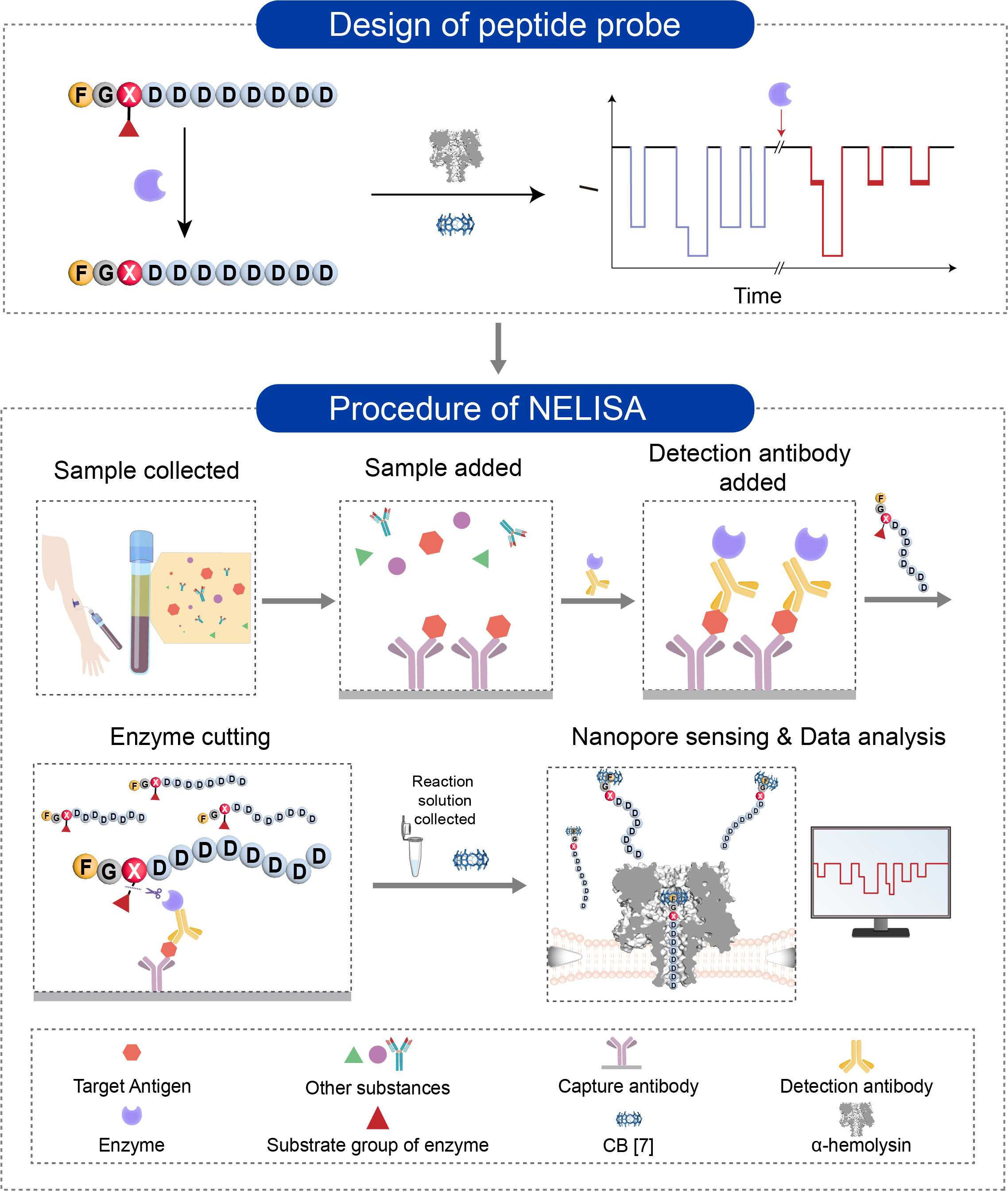 Our research group, led by Professor Hai-Chen Wu at the Institute of Chemistry, Chinese Academy of Sciences, has developed Nanopore-based ELISA (NELISA), a novel approach combining nanopore sensing technology with ELISA. This method enables simultaneous, quantitative detection of multiple biomarkers with remarkable sensitivity.