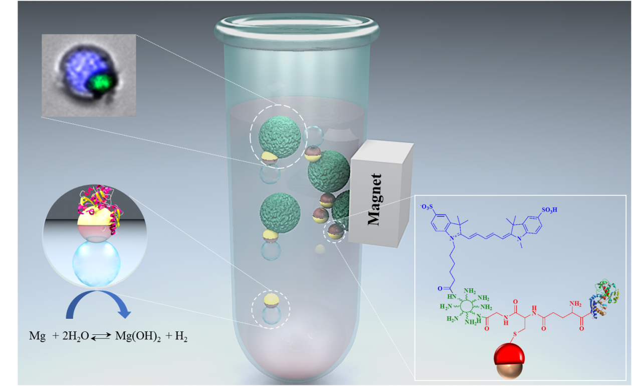 Figure 1. Schematic of the self-propelling MFN and cancer cell capture. Lower left side inset shows the upward moving nanorobot due to generation of H2 bubble. Upper left side inset shows cancer cell captured efficiently by MFN due to continuous motion through the sample thus greatly enhancing the interaction and binding efficiency with cancer cells. Lower right side inset shows the Schematic illustration of multicomponent MFN.