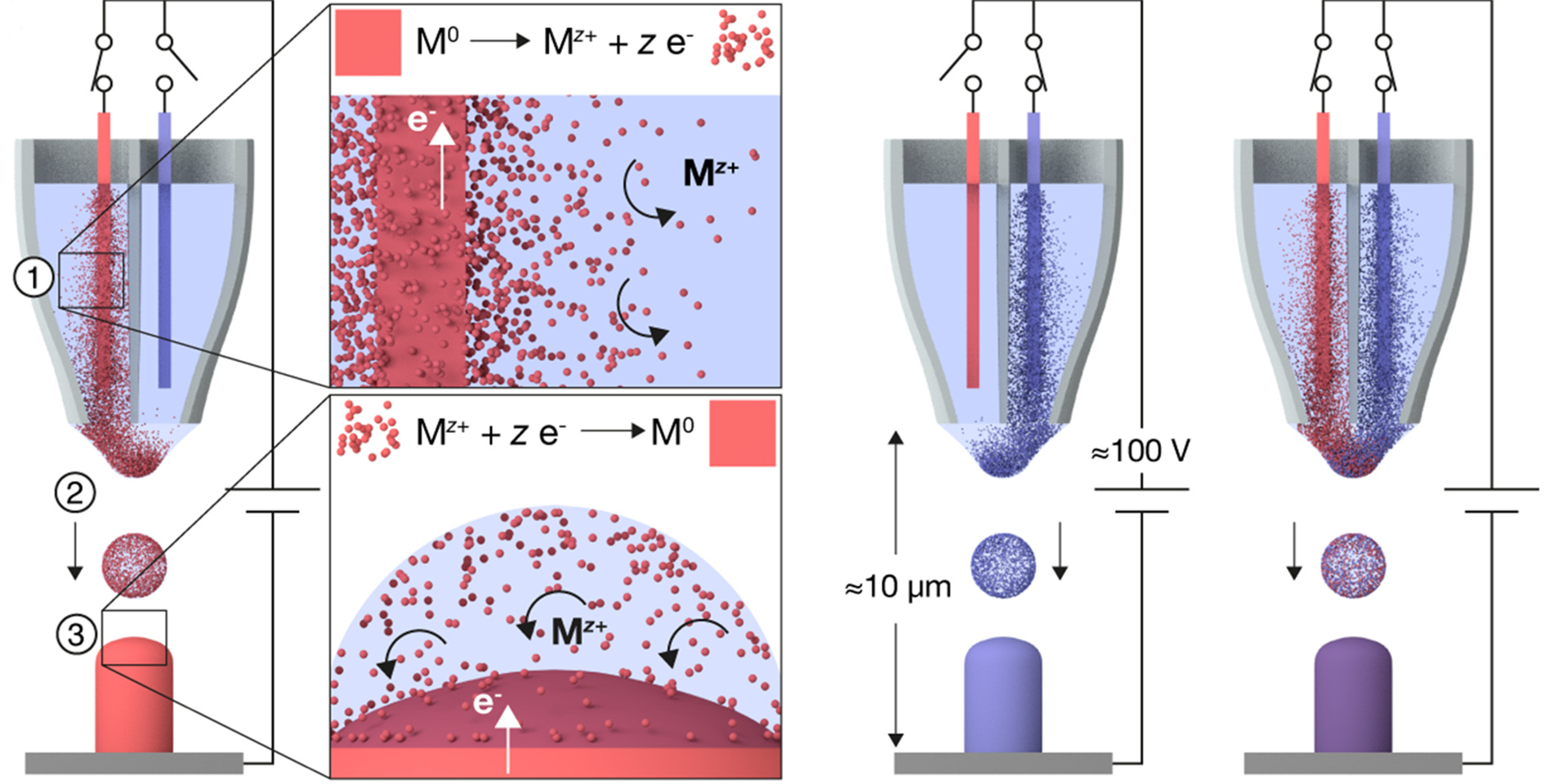 Fig. 1: Principle of multi-metal printing with EHD-RP. Solvated metal ions Mz+ are generated within the printing nozzle via electrocorrosion of a metal electrode M0 immersed in a liquid solvent. (2) Ion-loaded solvent droplets are ejected by electrohydrodynamic forces. (3) Upon landing, Mz+ ions are reduced to zero valence metal M0 through electron transfer from the substrate. Switching the oxidative voltage between different electrodes in a multichannel nozzle enables on-the-fly modulation of the printed chemistry.