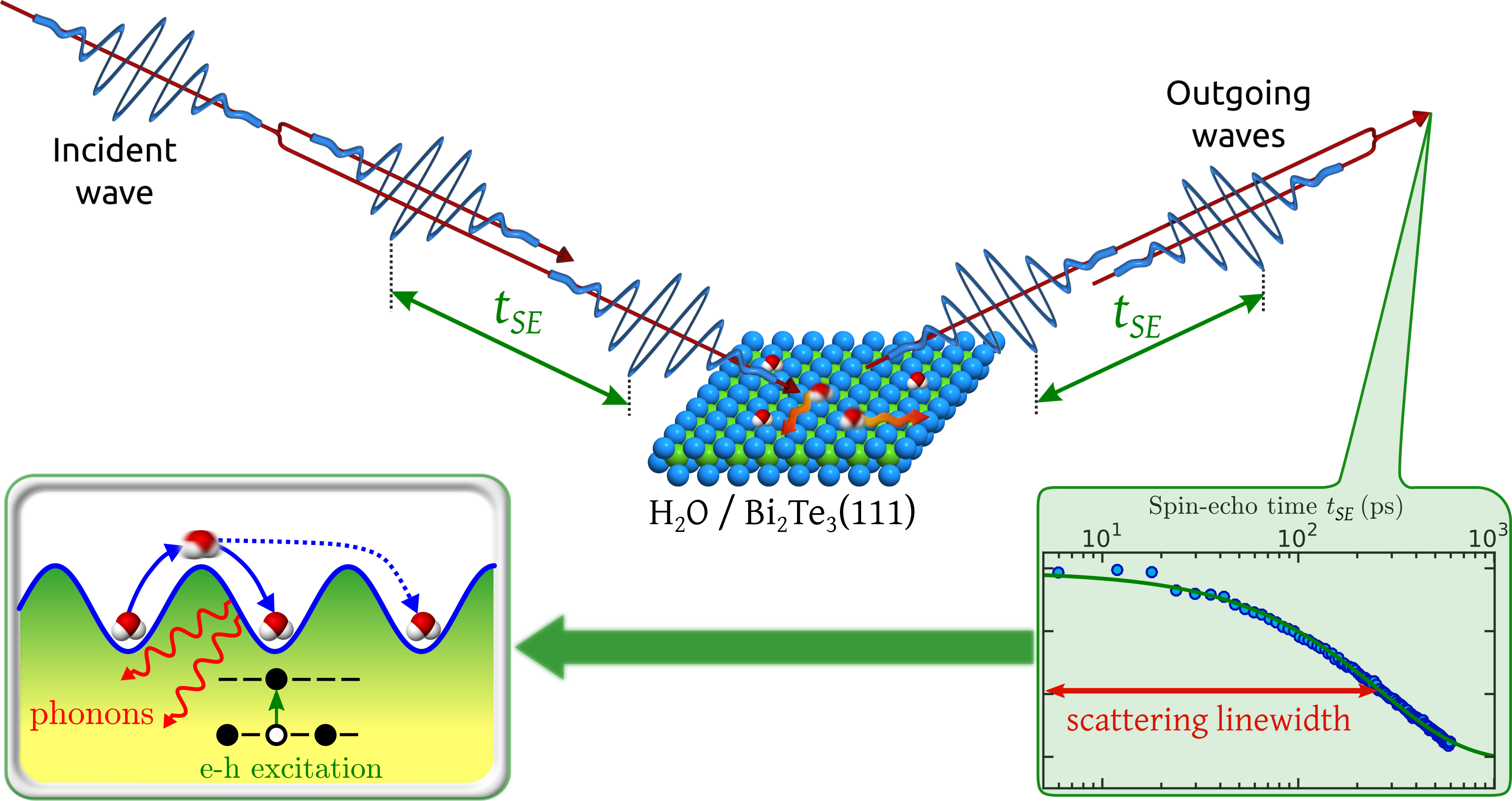 1: Movement on a sample surface can be probed by scattering two wavepackets, spread by a time delay tSE. Upon recombination of the two scattered wavepackets a loss in correlation is measured due to a small Doppler broadening upon scattering from the moving adsorbates (bottom-right panel). The measured scattering linewidth corresponds to the timescale of the molecular movement and allows us to determine the nanoscopic motion of water.