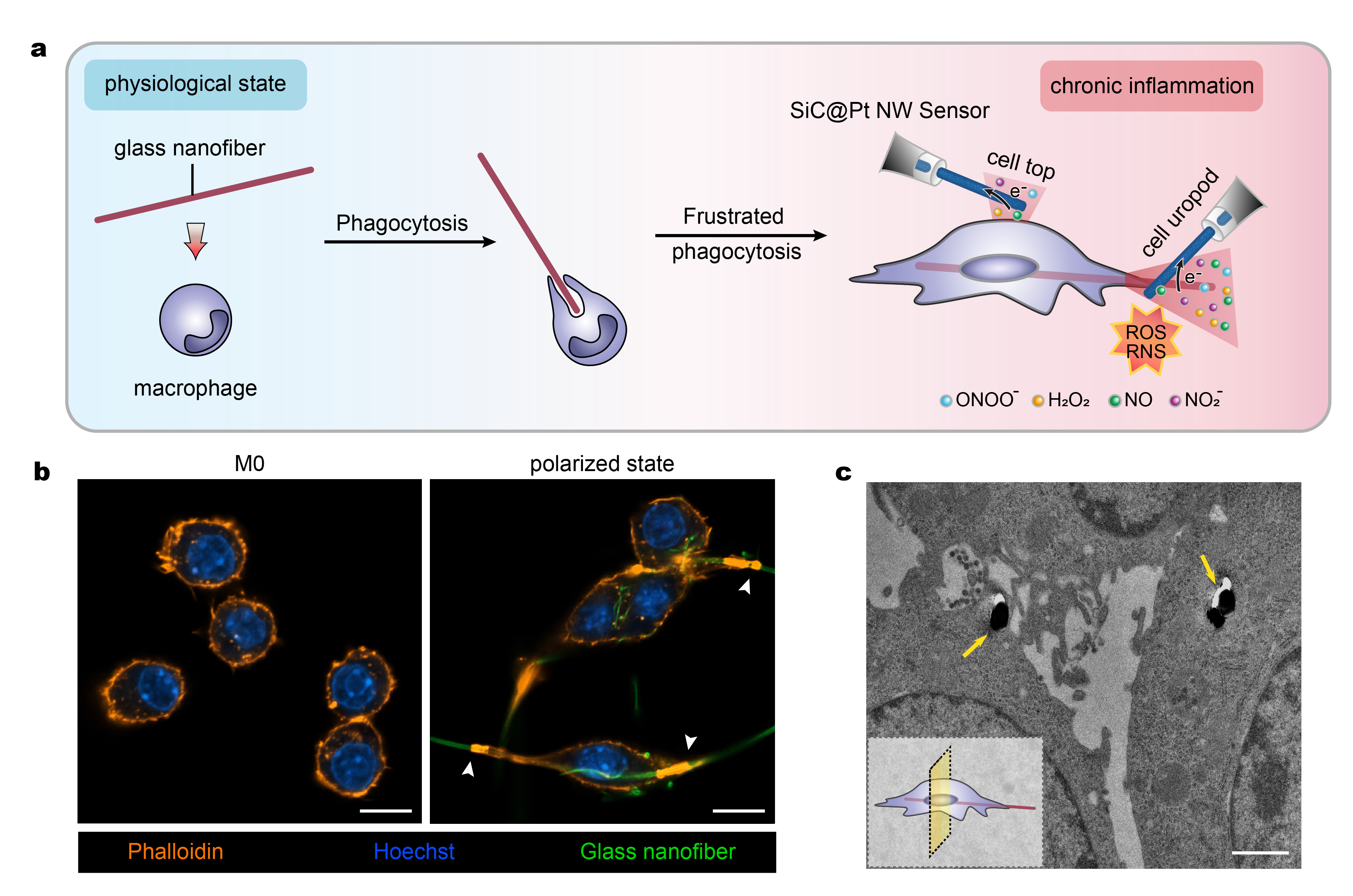 Fig. 1 a) Schematic diagram describing the frustrated phagocytosis of a glass nanofibre by a macrophage and the use of a SiC@Pt NW sensor for differentiating ROS/RNS released. b) Morphology of macrophages before (M0 state) and 12 h after frustrated phagocytosis (polarized state) of glass nanofibres. The highlighted orange areas pointed by the white arrowheads represent the actin rings present at the phagocytic cups. Scale bar, 10 μm. c) TEM of macrophages and after 12 h of frustrated phagocytosis of glass nanofibres (shown by yellow arrows); Scale bar, 1 μm.