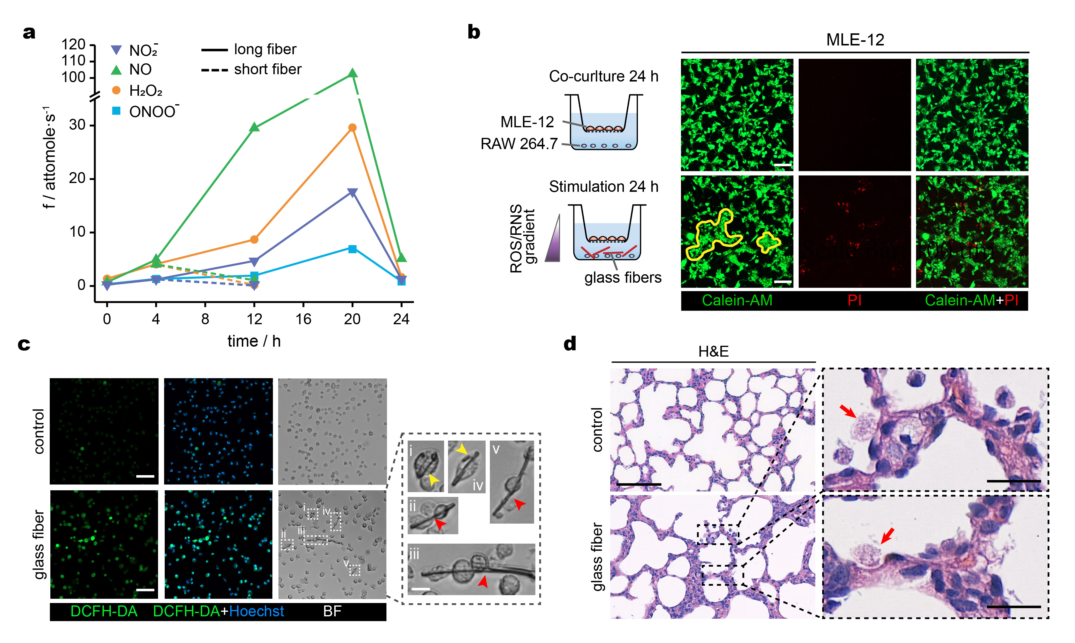 Fig. 2 a) Time variation of the production rates of the four primary ROS/RNS released near a macrophage phagocytic cup during phagocytosis of a long and short glass nanofibre. b) Co-culture assay and calcein-AM and PI fluorescent staining of MLE-12 cells with or without RAW 264.7 cells exposure to glass nanofibres; yellow contours delineate clusters of aggregated cells; scale bar, 100 μm. c) Bright-field and fluorescence microphotographs of alveolar macrophages stained with DC-FHDA (ROS probe) with magnified images of single macrophages undergoing phagocytosis (yellow arrowheads) or co-phagocytosis (red arrowheads) of long glass nanofibres; scale bars, 50 μm and 10 μm. d) Representative H&E staining of lung sections with and without intratracheal glass nanofibres instillation for 14 days; alveolar macrophages pointed by the red arrows in the magnified image; scale bars, 100 μm (left), 20μm (right).